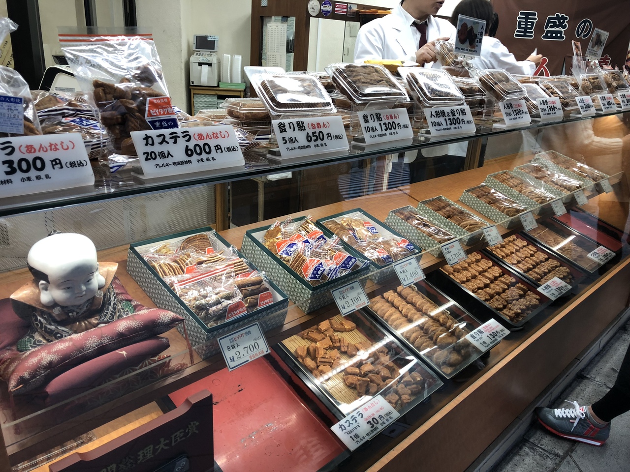 水天宮の大きな交差点の角にある、青い看板でとても目立つ重盛さんは、人形焼の老舗です。