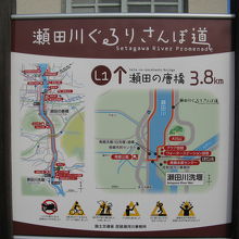 瀬田唐橋から瀬田川洗堰間をぐるりと一周できる散策路が“瀬田川ぐるりさんぽ道”として整備(添付写真を参照ください)されています。