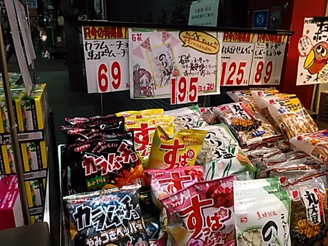 黒門市場の比較的南側にあります。黒門市場は鮮魚、青物、果実、肉などの食材を扱うお店が150店舗くらいありますが、お菓子のデパートと言う名前に惹かれ,お店に入ってみました。お店の商品は棚に並べるのではなく、平台に並べてあったので手に取りやすかったです。びっくりなのがその価格です。人気のある商品や昔からあるロングセラー商品が見たこともない価格で売ってました。カラムーチョ69円は驚愕でした。店内にはPOPやグッズがいっぱいあり、見ていて楽しいかったです。