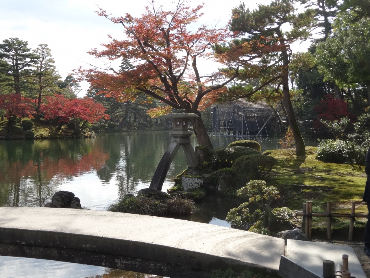 兼六園と言えば、ことじ燈籠と霞ヶ池の風景が有名ですが、秋は紅葉が池に映えて、とてもも綺麗な風景を楽しむことができます。外国人の方も沢山来園していました。