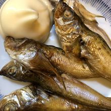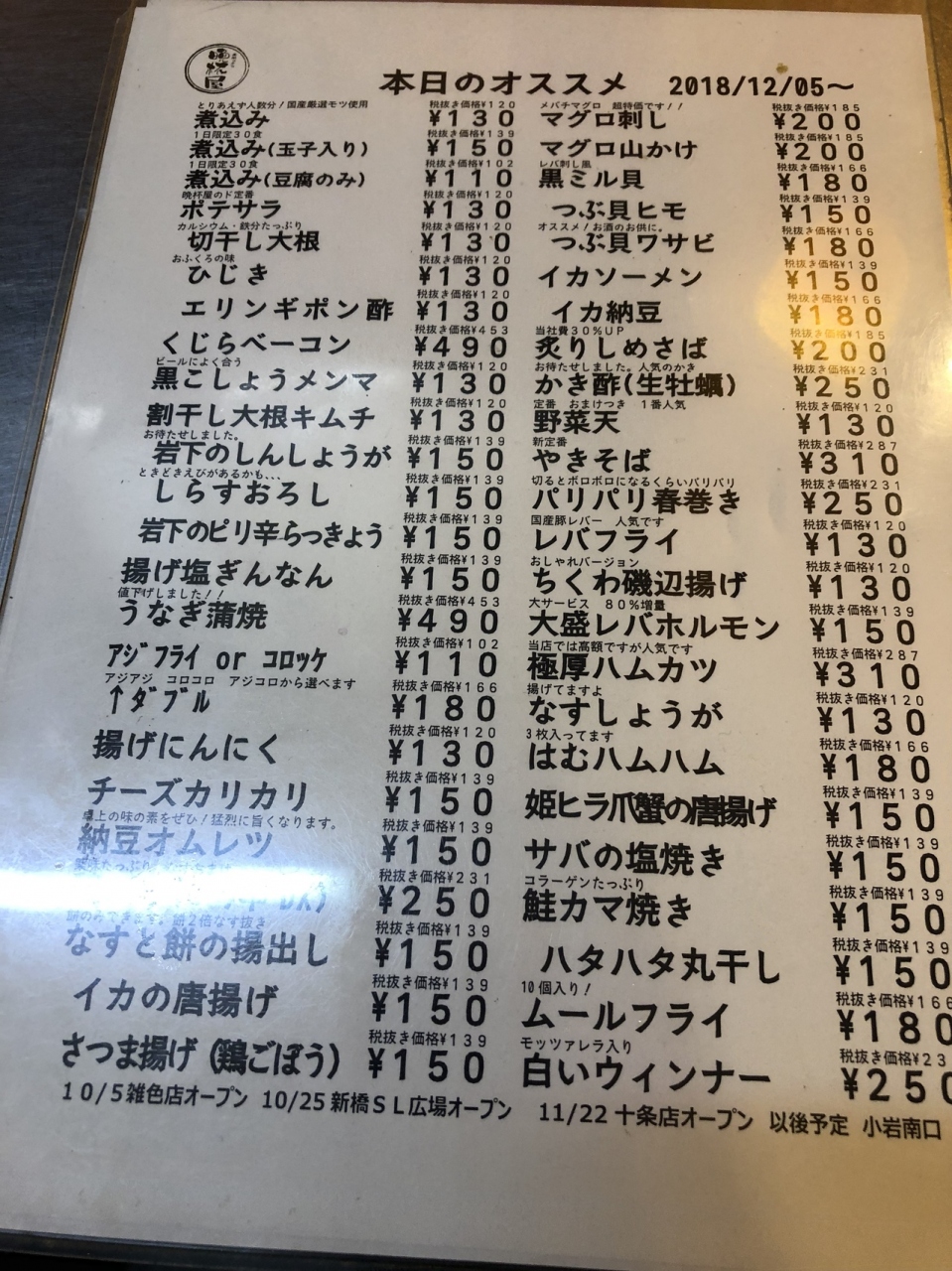 煮込み、しめ鯖炙り、レバーフライ、厚切りハムフライ、ハタハタ丸干し焼き、鮭カマ焼き、生ビール、ハイボール数杯