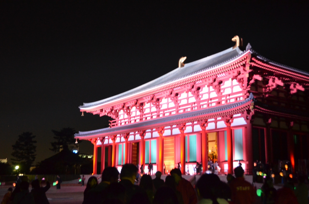 興福寺中金堂、江戸時代以来の再建が落成しました。朱塗りの外観が鮮やかです。夜間はまた、特別の照明です。場所的には、近鉄奈良駅と東大寺の中間と言えば良いでしょうか。一日をかけて散策するにはお誂え向けでしょう。