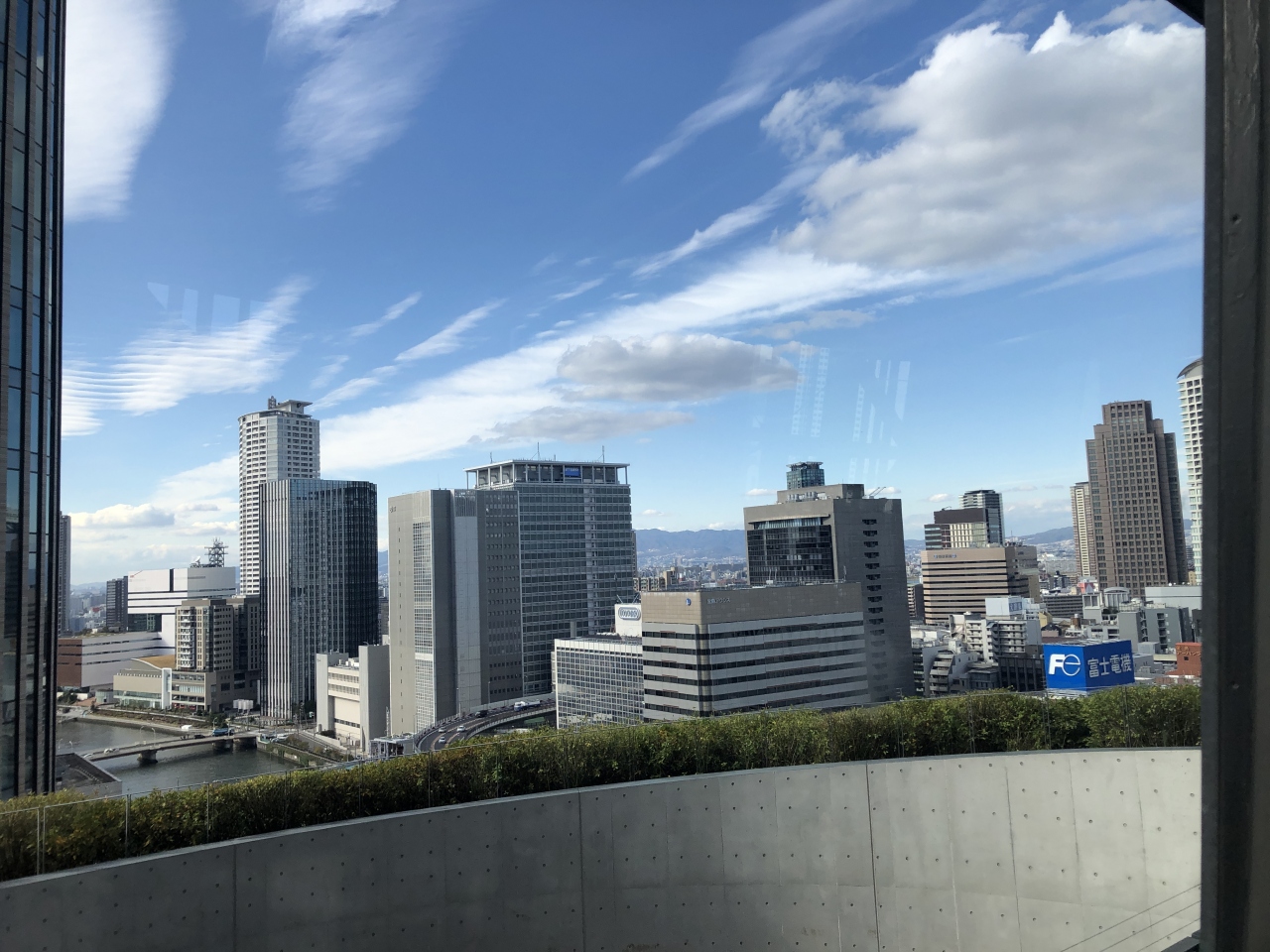 イタリア文化会館に用事があって行った時に寄りました。フェスティバルホールと朝日新聞社がに建て替えられて四ツ橋筋を挟んでツィンタワーができました。そこの東側のタワーの13階、エレベーターの乗り継ぎ階は展望フロアになっていて、そこのエレベーターホールの陰には喫茶室もあります。展望フロアからの眺望が楽しいです。