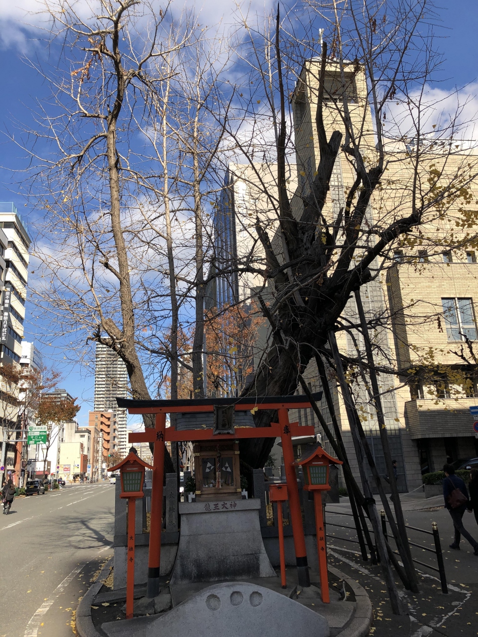 天満から扇町公園を抜け、読売テレビ付近から梅田新道を目指して西に歩いていると、道の真ん中に古いイチョウの木があって、お参りしている人を見かけた。大阪にはよくある道の中に切られずに残した巨木だけれど、イチョウは珍しく、思わずシャッターを切った。
