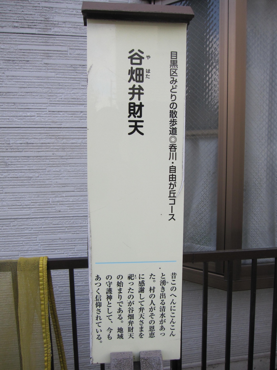 自由が丘周辺を散策した際、谷畑弁財天を見つけました。通りに案内板がありましたが、