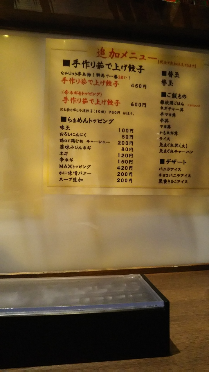 高崎オーパの6階にフードコートにあるラーメン、高崎市内に何店かあるうちの一つと思われる。食券の販売機は現金のみなので頼むとWAONでも払うことができる。