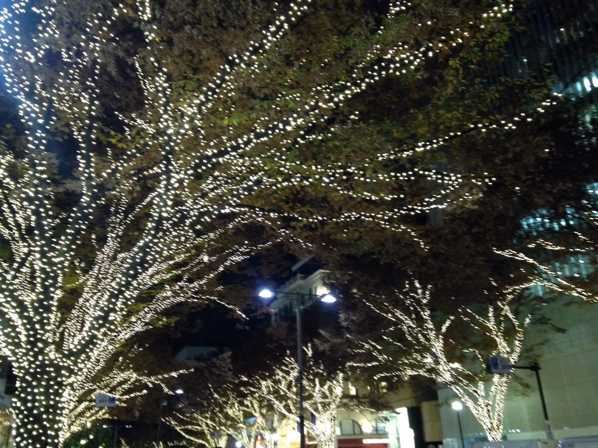 表参道のケヤキ並木の枝に沿ってLED電球がびっしりと飾り付けられていて斜めにのびる光が美しいです。