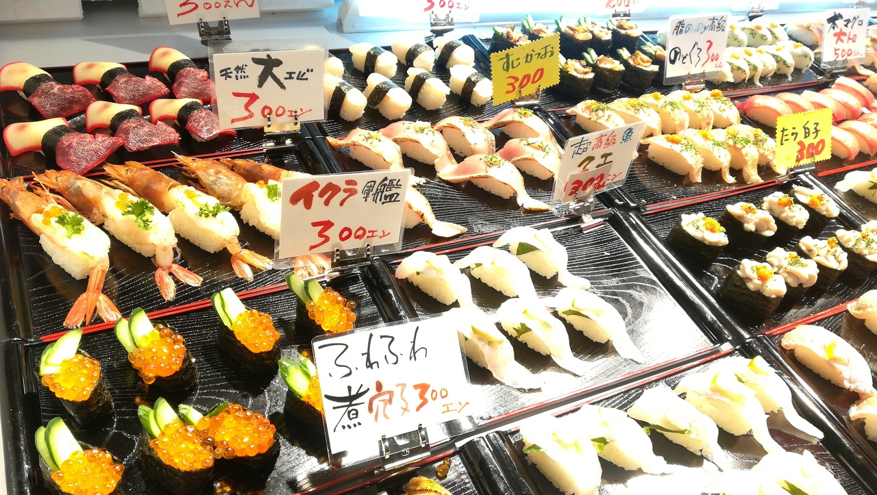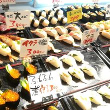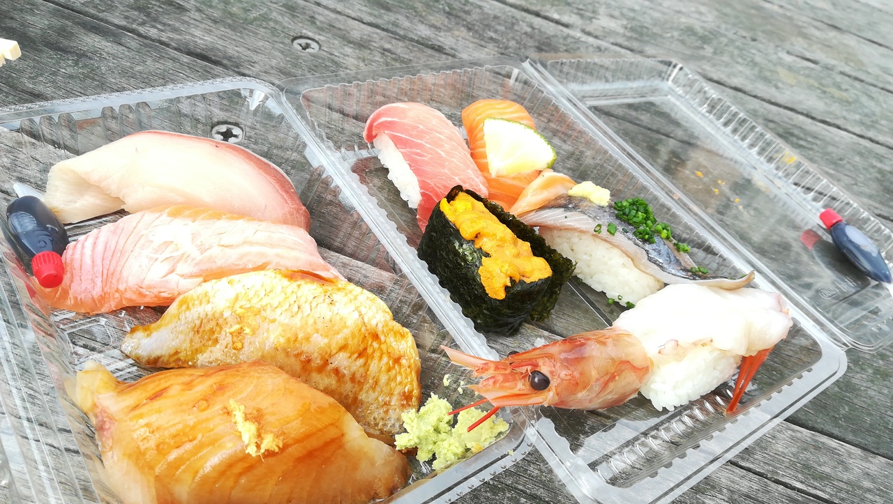 場内はお店がたくさんあるためと同じネタでも大きさや値段もさまざまなので吟味が必要です。場内にテーブルもあるのですが人が多いため多くの人が外の芝生や階段で食べています。飲み物は高いのでどこかで買って持っていくのがおすすめです。お寿司ですが見た目は多く美味しそうだだったのですが、観光向けだからか、残念ながら魚の味が薄くあまり美味しくありませんでした。