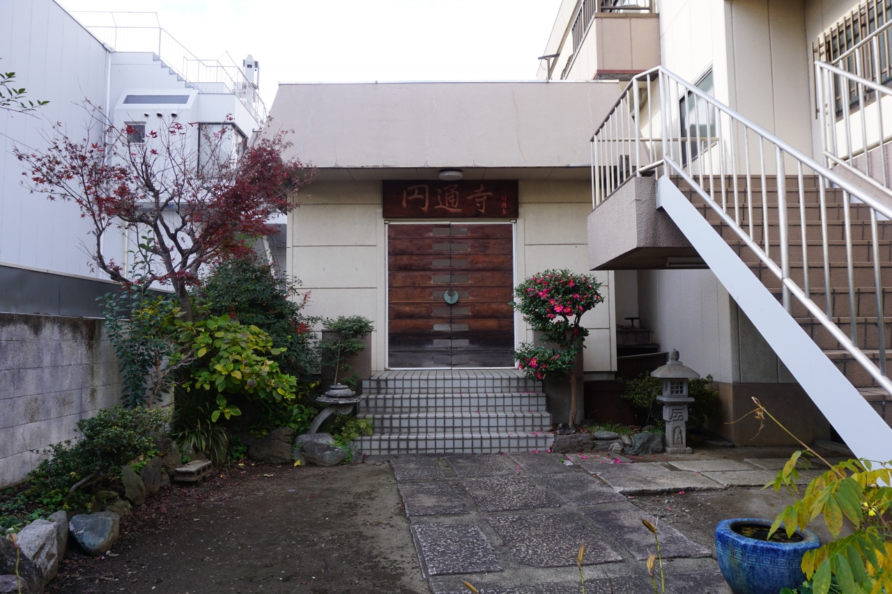 津之守坂入口の交差点から下っていくのが円通寺坂。その坂の名前の由来になったのがこの寺です。しかし、敷地内にはマンションみたいなビルが建っていてお寺のような感じがしない。よく見ると庭のようなスペースに小さな仏堂がありました。日蓮宗の寺のようですが、特にどうということはありません。