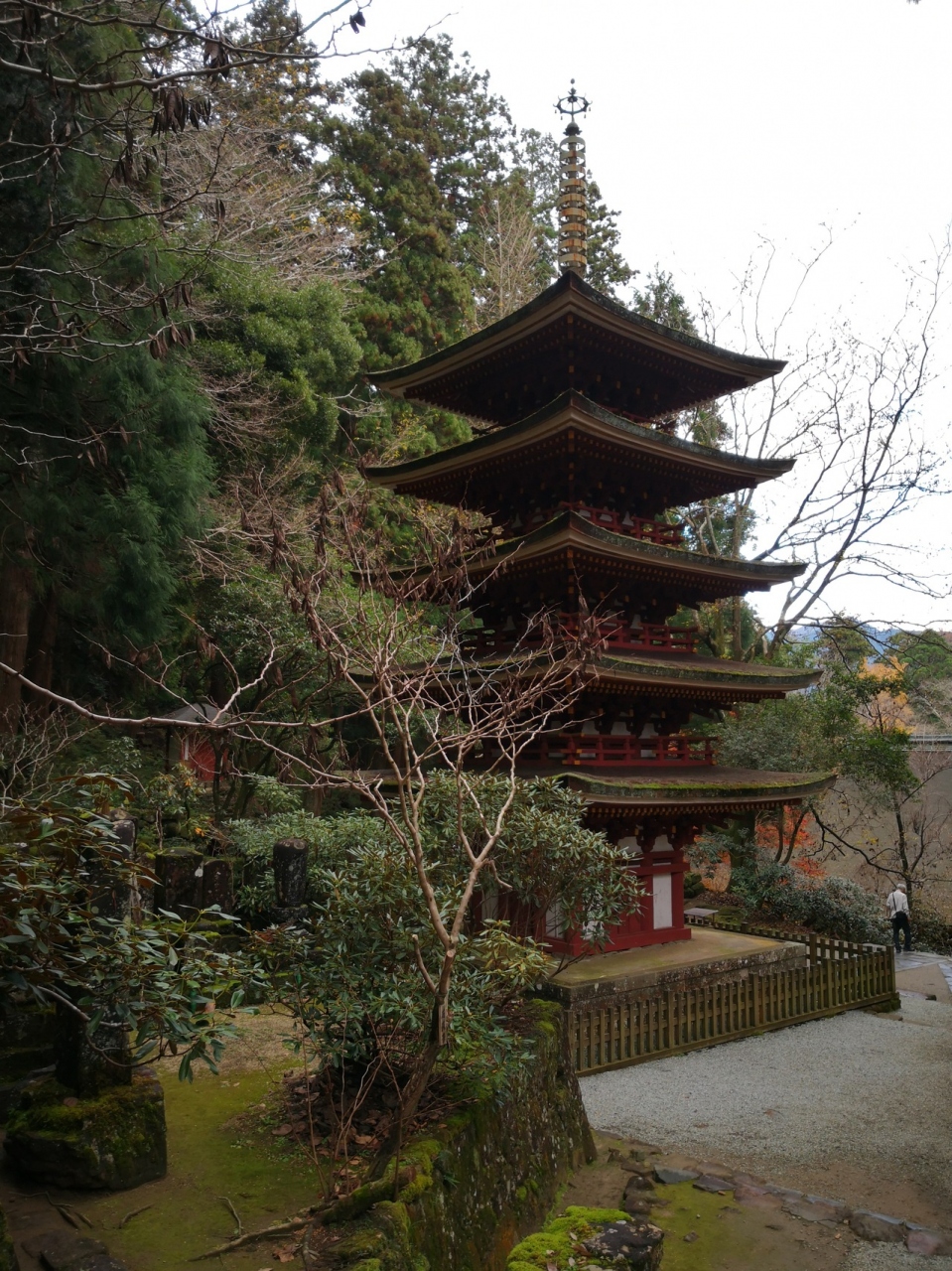 奈良の室生寺に有る、屋外に建つものでは、日本で一番小さい五重塔です。16.1メートルで、小さいですが国宝です。階段を上がって行くと左に続く道があります。