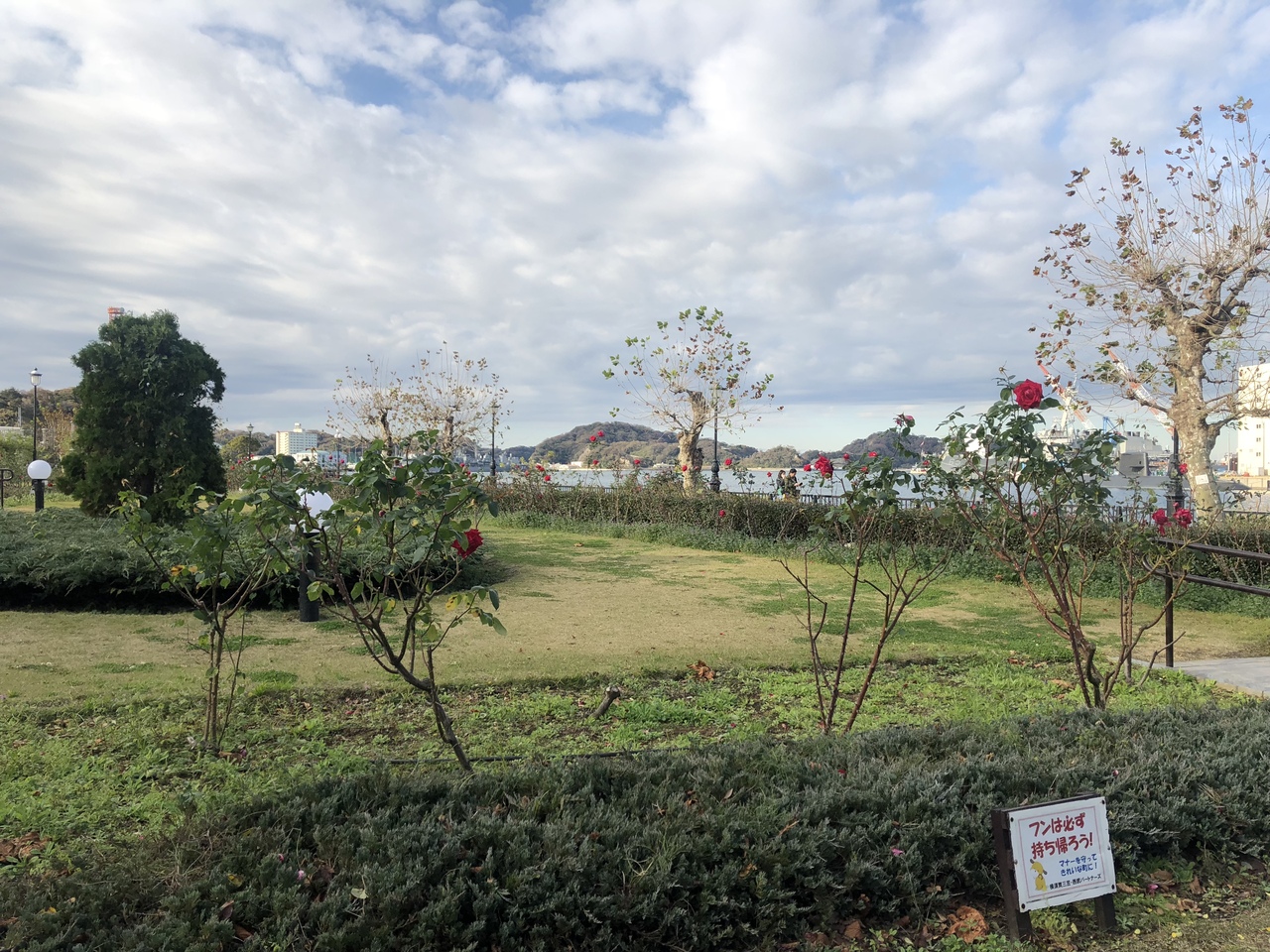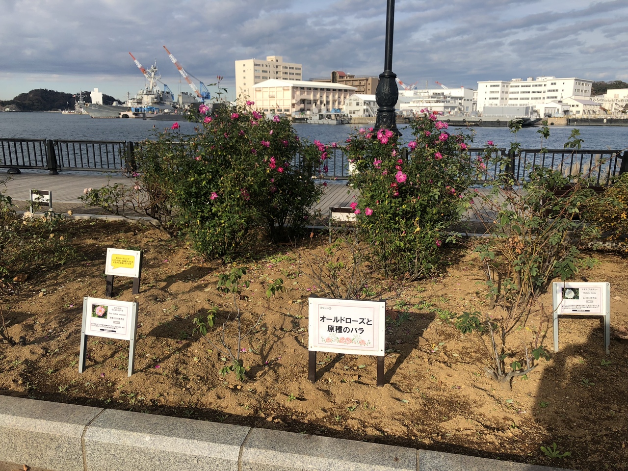 横須賀らしく軍艦や潜水艦などがみえる軍港のすぐ横にあり、海沿いのデッキを散策できるようになっています。ローズガーデンは「日本のバラ」や「オールドローズ」「香りのバラ」など、くくりごとに花壇を分けて植えられていて、植えている方の工夫が感じられて素敵です。今年は暖かい秋だったので、12月初旬でもまだバラがだいぶ咲いていて、香りを楽しめました。