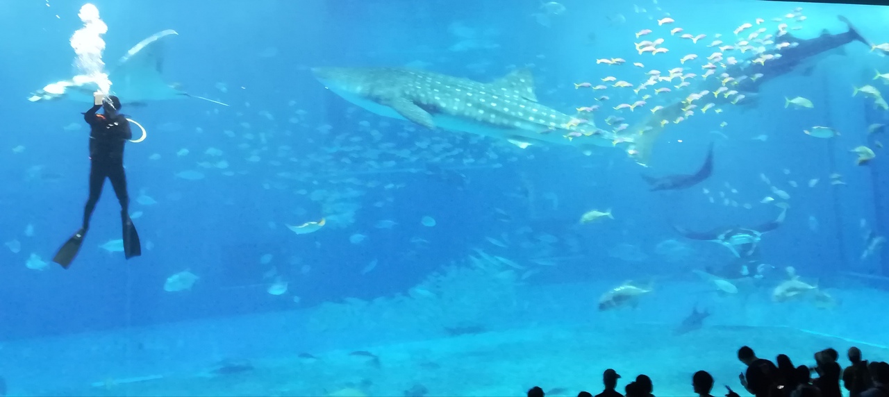 海洋博公園内の一角にある水族館で、巨大プールが見どころです。建物も個性的だと思いました。悠々と泳ぐジンべエザメが有名ですが、職員が水槽内から窓を拭く姿がとっても印象的でした。ヒトデやナマコなどを触ることもできる体験コーナーもあり、子供たちが喜んでいました。