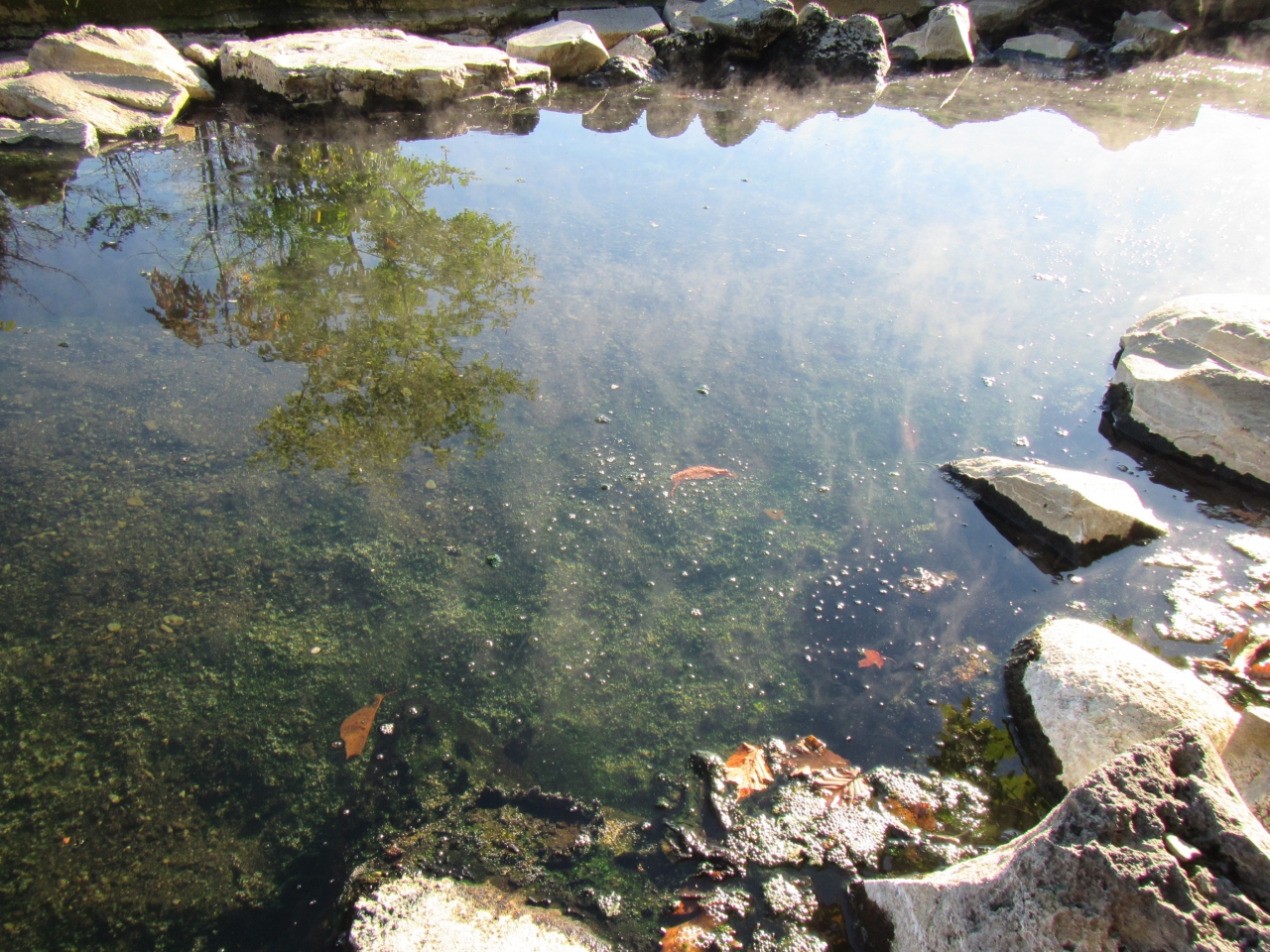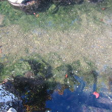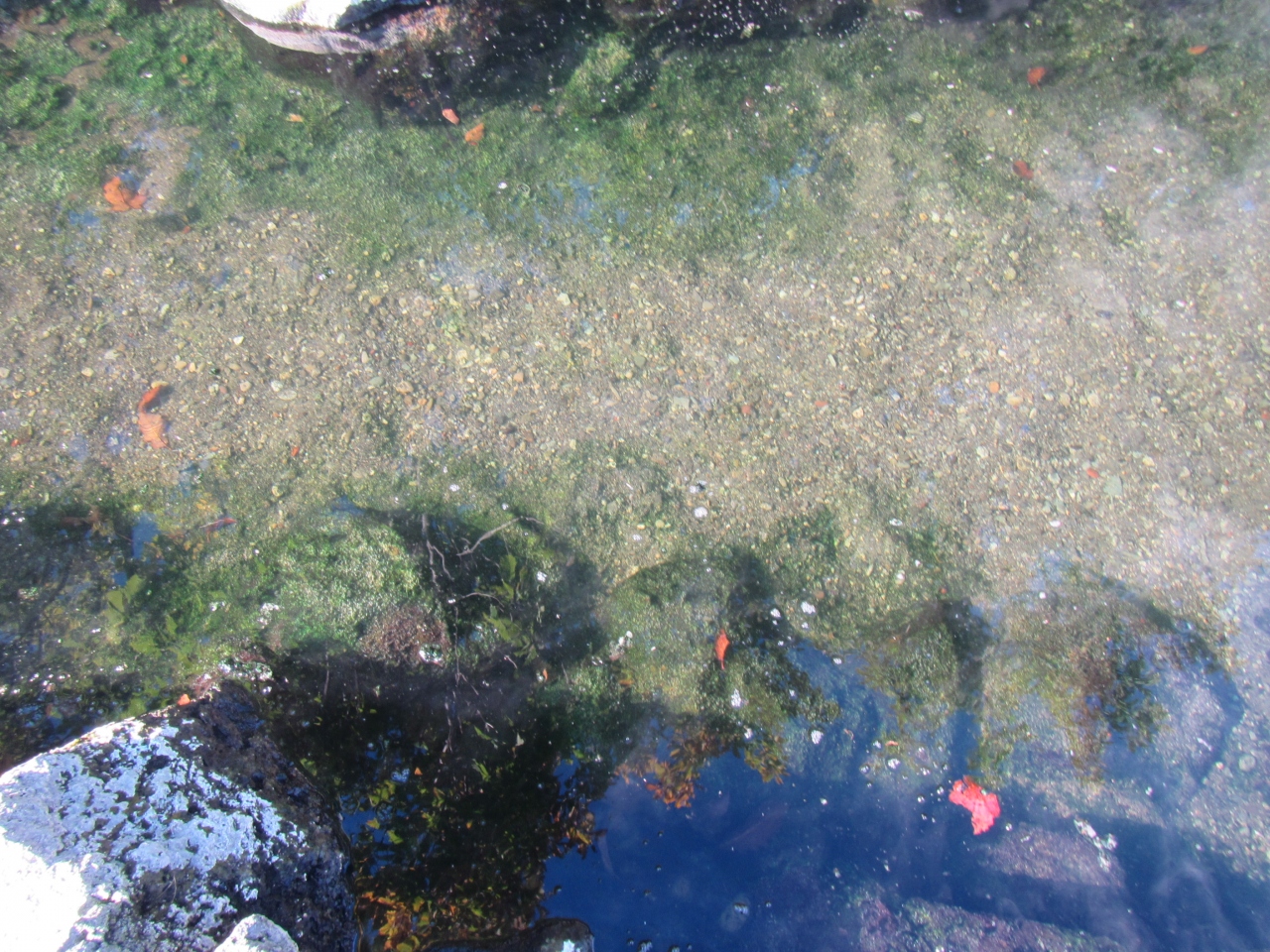 お湯の温度は熱めで、屋外の風呂だけに、本当の池のように底に藻が生えているように見えました。