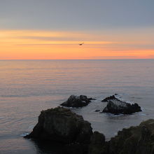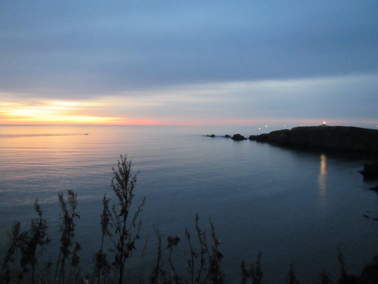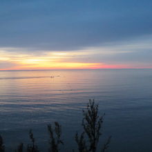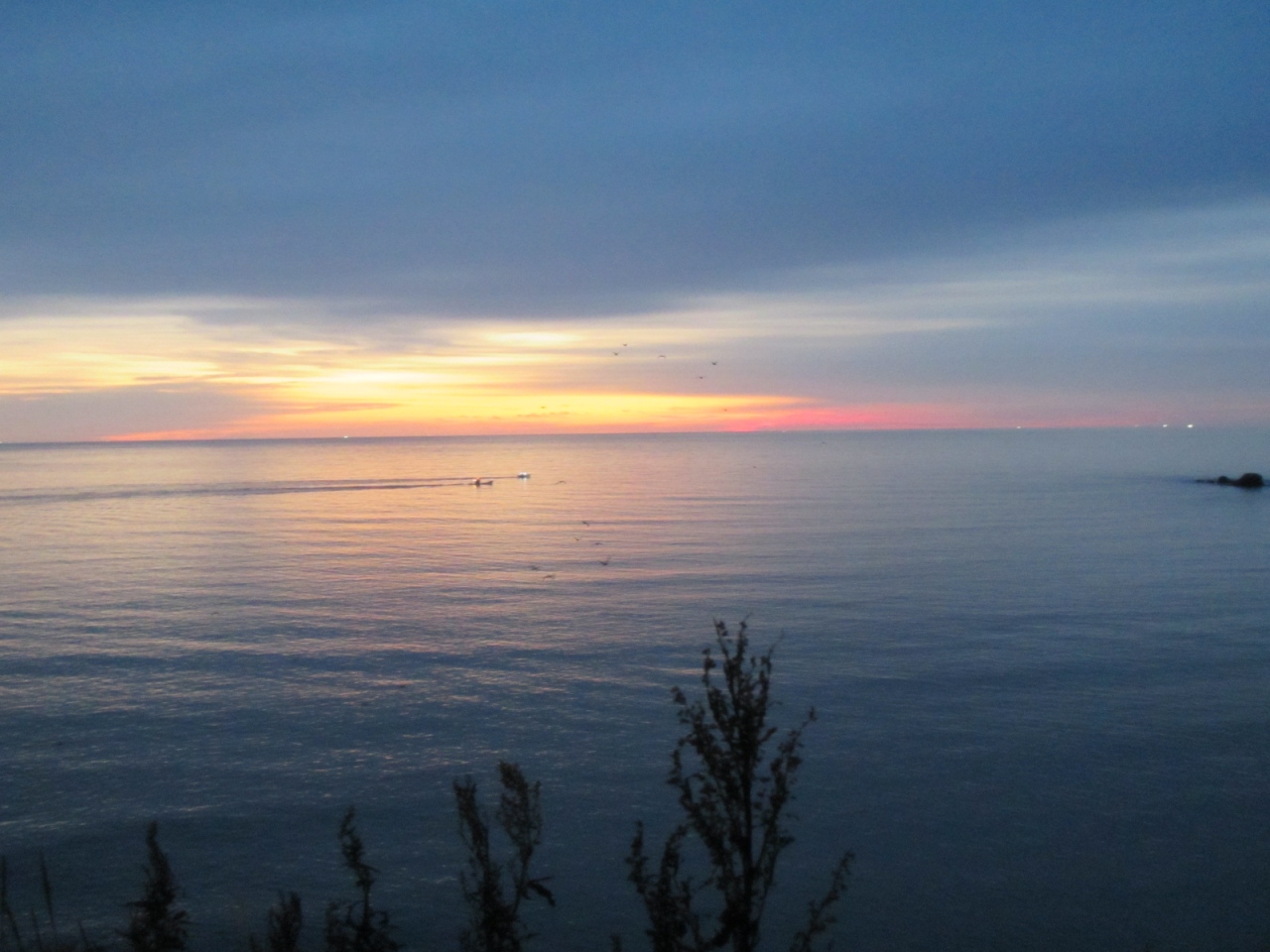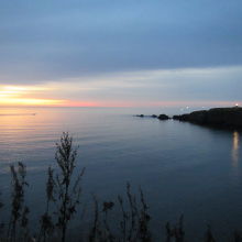 朱鷺色の空が広大な海をも照らし、漁火がきらめく感動的な光景でした。