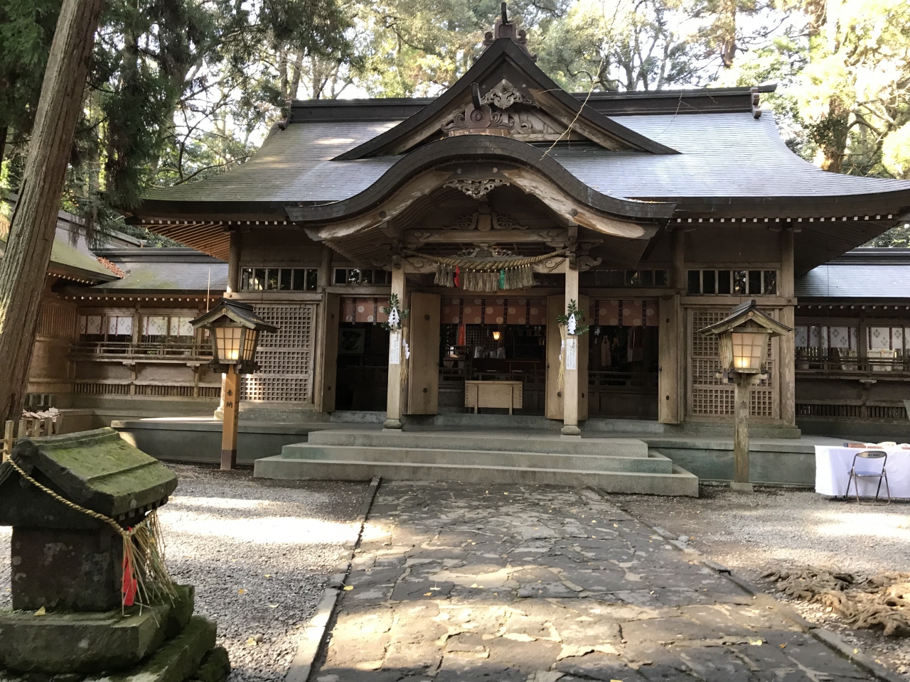 創建は1900年も前だそうです。土曜日でしたが、そこまで混雑しておらず、ゆっくり参拝できました。夫婦杉と並ぶ願掛けスポット「鎮石」は、本殿の説明がある看板の前近くにあり、ちょっとわかりづらい場所でした。