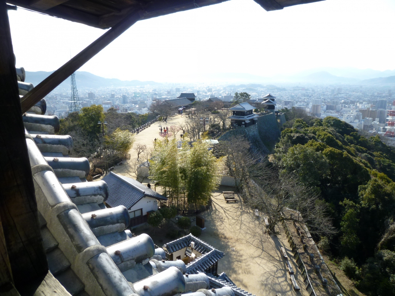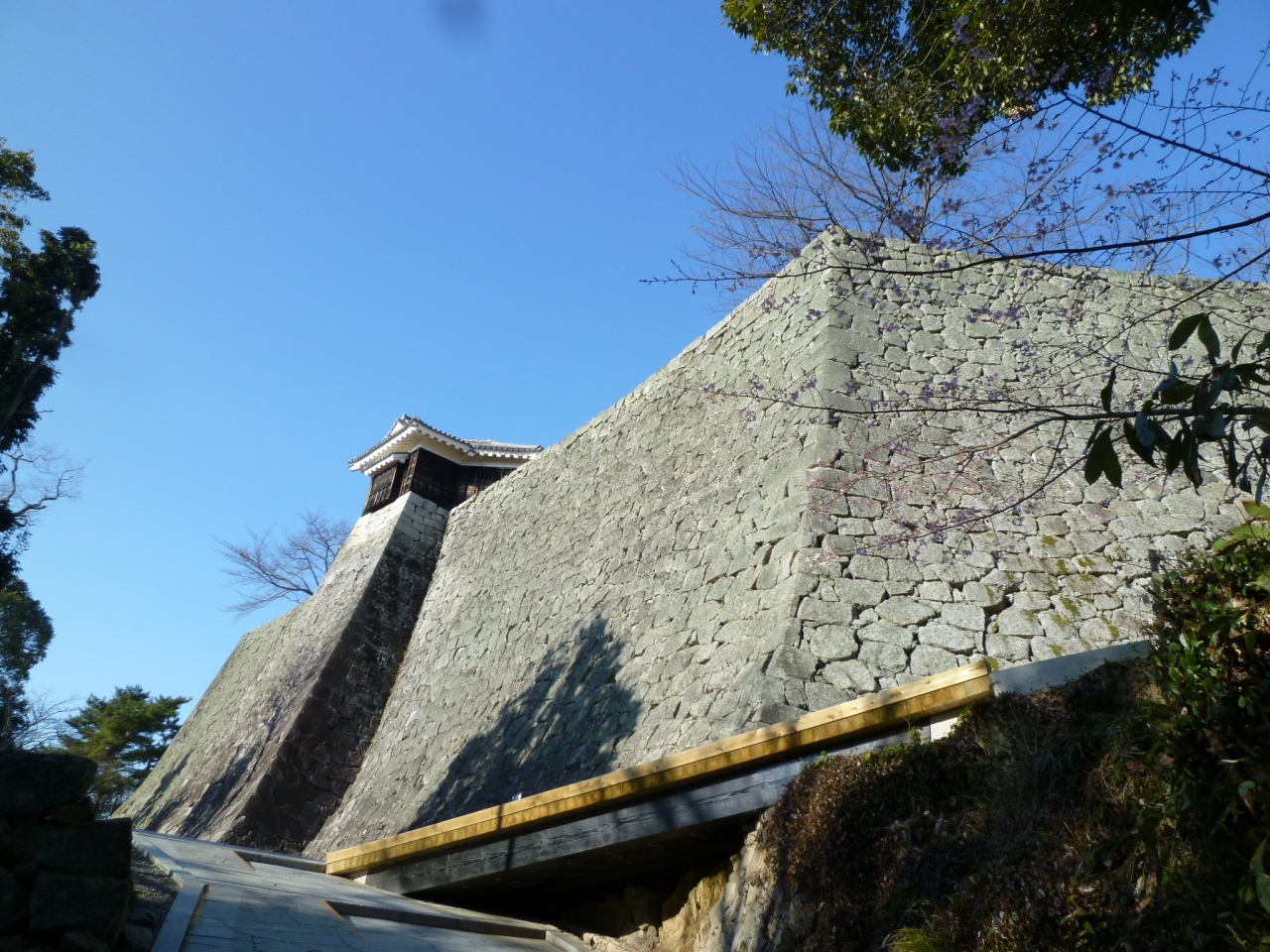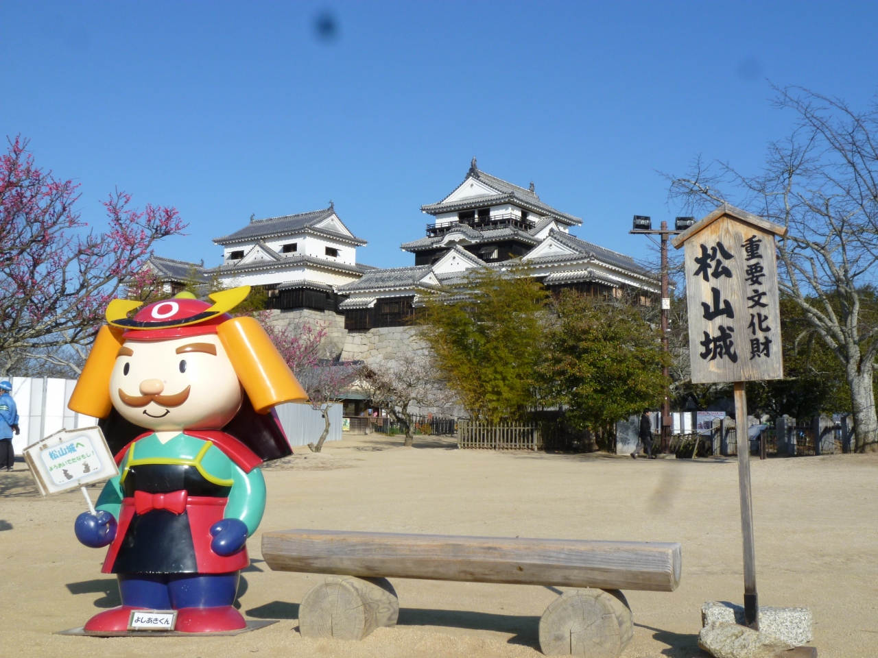 東雲神社方向から徒歩で行きました。なんといっても天守に向かいまでの石垣の高さと美しさに圧倒されました。天守を望む広場には梅が咲いていて、桜の木もありました。天守は4つつながっているめずらしい連立天守で、眺めもすばらしいです。広場には、よしあきくんもいて、記念撮影ができます。