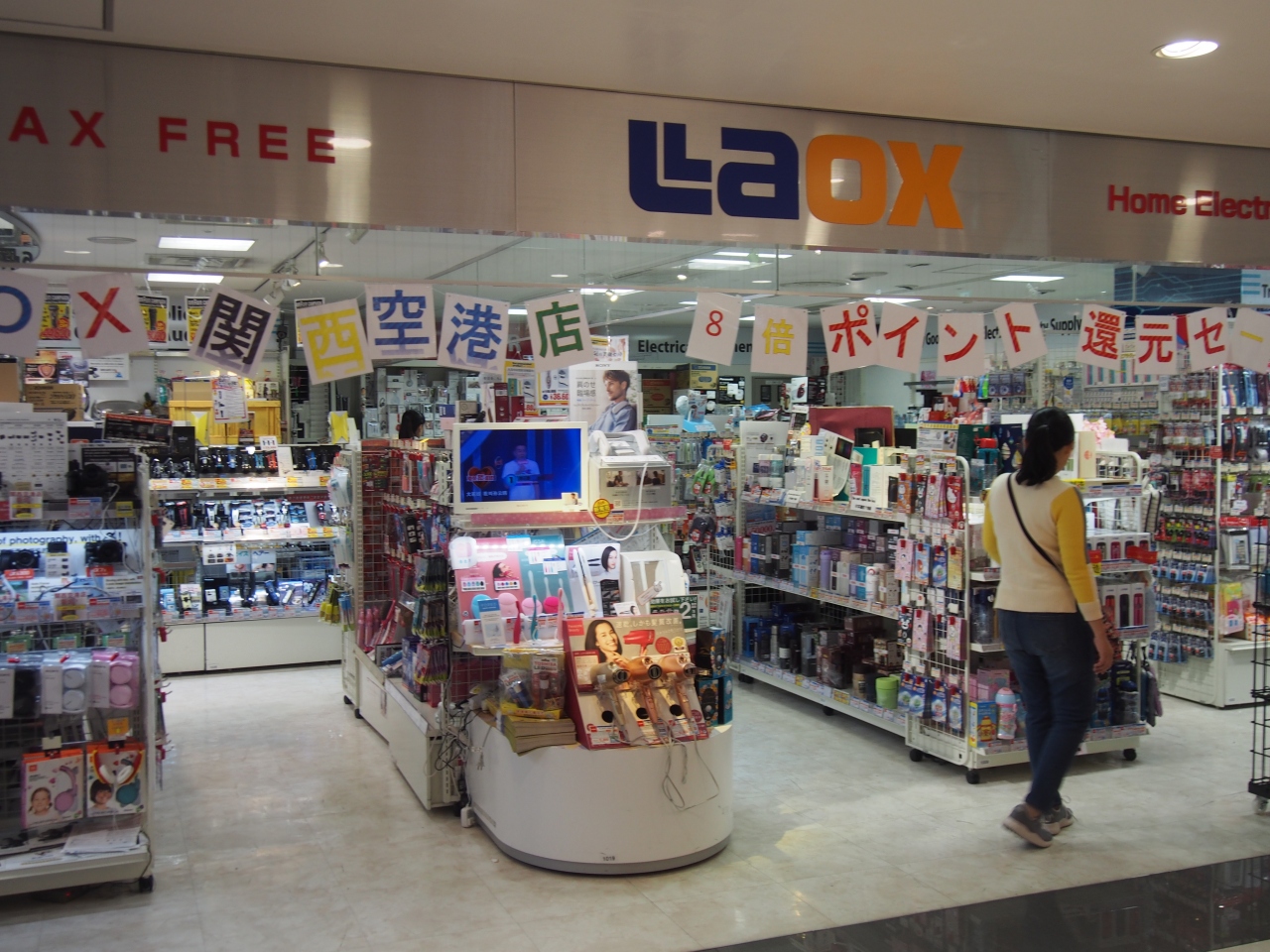 関西国際空港の3階のショッピングエリアにあるラオックスの店舗です。場所がら売り場面積は狭いです。海外旅行客のインバウンド目的の店舗であるので、置かれているのはそれぞれ普段目にするものより高級品が多いです。電気炊飯器、美顔器、電気かみそり、モバイル機器などが多く売られています。持ち帰りも考えて手荷物くらいのもが多いようです。ただ街なかのほうが安いような気はします。