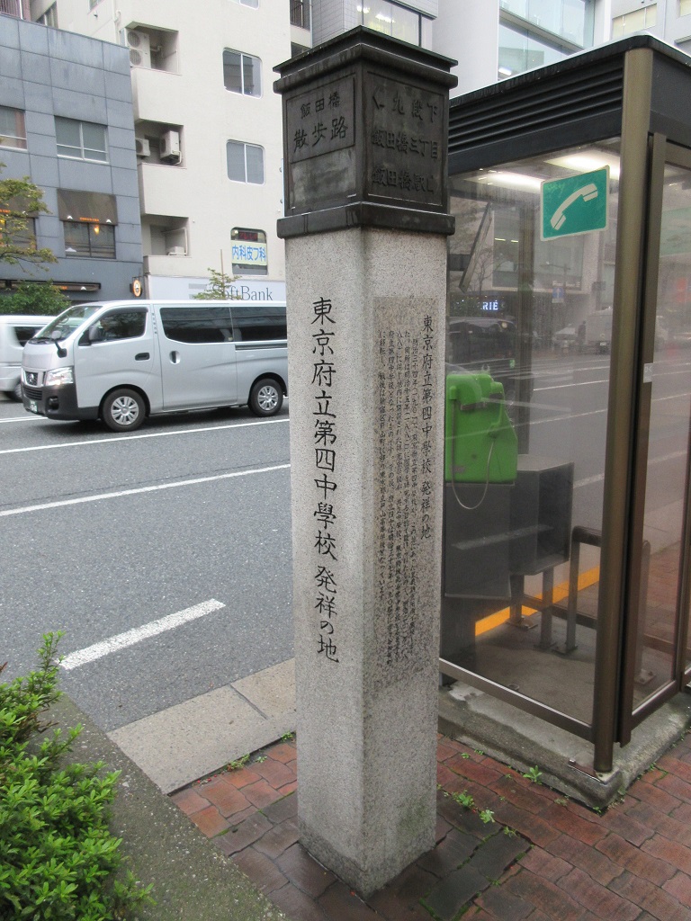 JR飯田橋駅から目白通りを九段下駅方面に向かって歩いていく途中、歩道にはいろんな歴史的な出来事の案内標識が建っていました。東京区政会館そばには「東京府立第四中学校発祥の地」を示す碑がたっていました。説明を読むと明治34年に、今の東京と陸戸山甲と学校の前身となる東京府立第四中学校がこの地に開校したことが分かりました。有名な学校らしい歴史を知ることが出来ました。