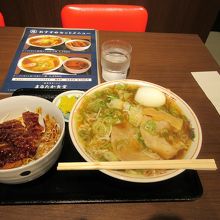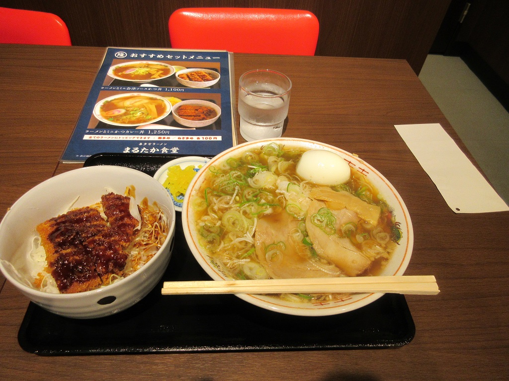 会津若松駅に近いホテルに滞在していた際、駅舎を出て右手にある「まるたか食堂」を利用しました。喜多方ラーメンとミニ会津ソースカツどんのセット1100円にネギ増量で100円をプラスして1200円でした。会津ソースカツどんは予想通りの味で、喜多方ラーメンは昭和の昔風の味付けで、いたって普通のお味でした。