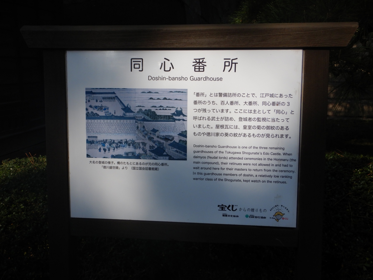 大手門から東御苑(江戸城跡)に入り、三の丸尚蔵館を過ぎて、最初に見ることができる江戸城内の建物が同心番所だ。ここは江戸城に登城して来る者の監視に当たっていた。こここから道は大きく左曲がり、百人番所に前に出る。城の中の道は侵入者が一気に中に入れないように、かなり曲がりくねっている。