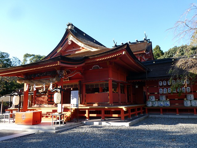 霊峰富士山信仰の総本山である富士宮市の富士山本宮浅間大社を訪れました。よく晴れた冬の1日でした。神社前にはほどほど広めの駐車場があり、朱塗りが美しい楼門を入り、拝殿に向かいお参りしました。いわば徳川家康の地元。1604年、家康が造営し、壮麗きわまる神社だったようです。その後、安政などの地震で壊れましたが、本殿・幣殿・拝殿・楼門などほぼ中心的な建物は残っています。さすがというところでしょうか。本殿は重要文化財、楼門などは県指定の文化財になっています。富士山頂上には奥宮が置かれています。