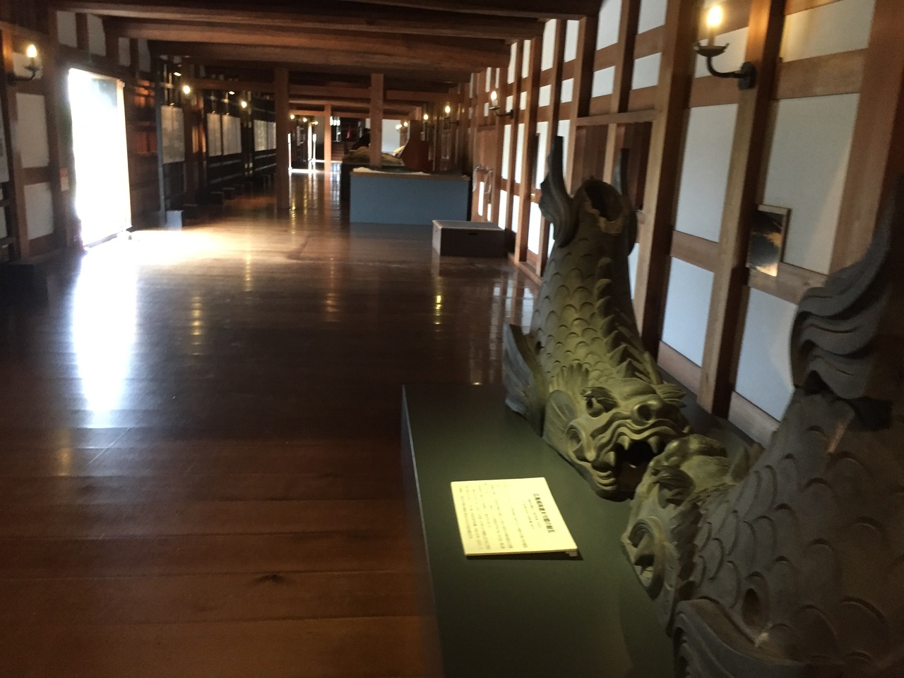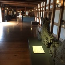 平櫓と太鼓櫓の間の部分を多聞櫓というそうです。表御門をくぐり二の丸広場から無料で誰でも入場できます。中に入ると長い廊下のようになっています。中には、城の屋根に乗っていたしゃちほこの瓦が展示されていました。