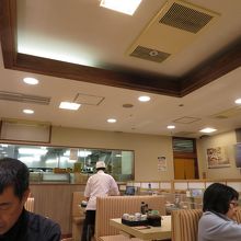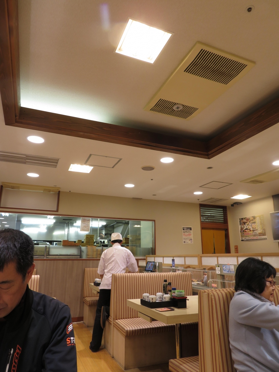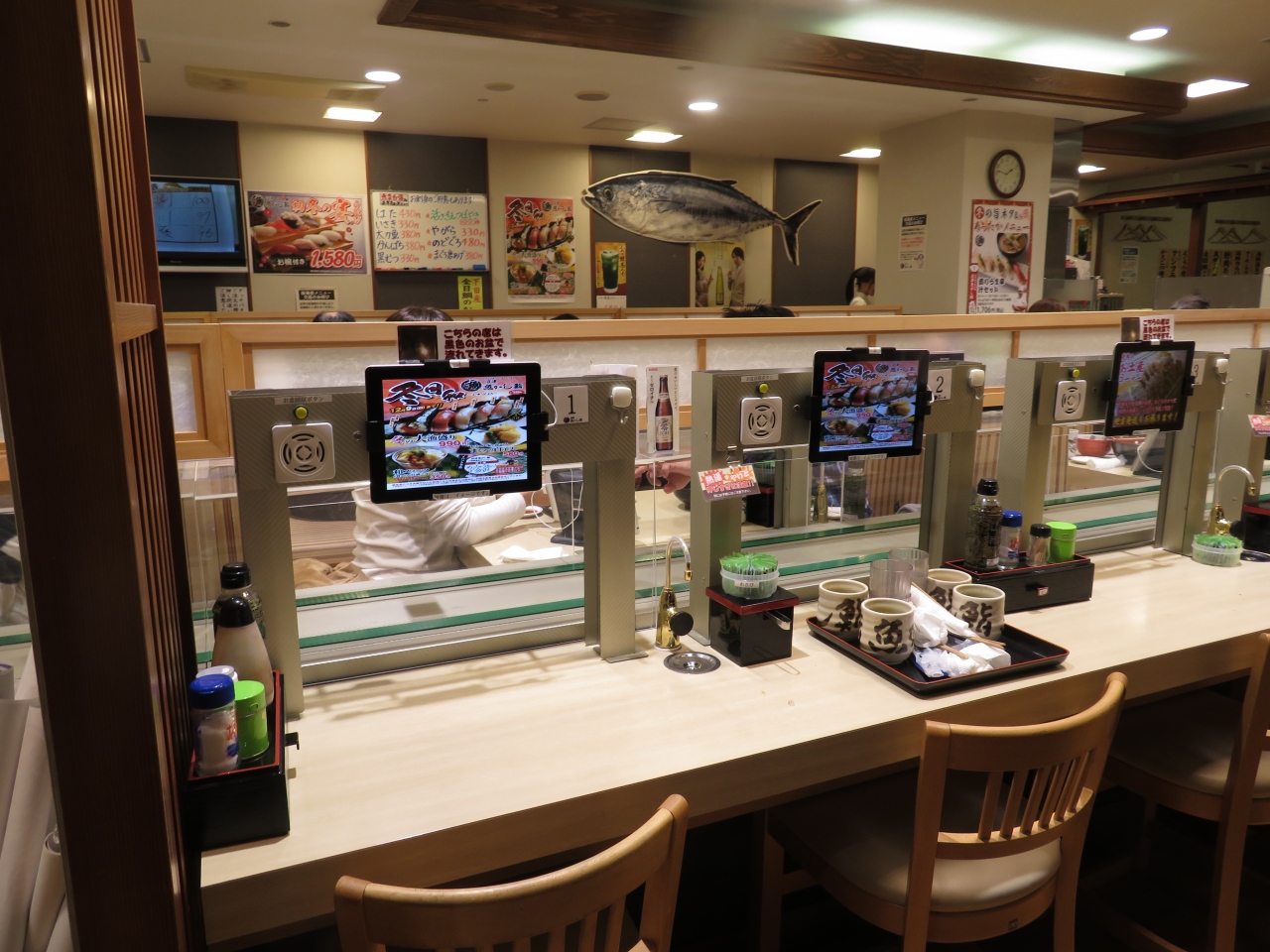 流れ寿司で、レーンに乗って席の前で止まり受け取り、トレイだけまた戻します。