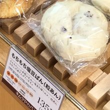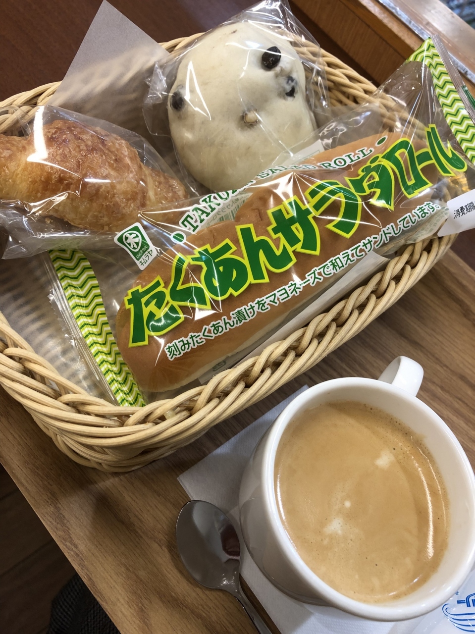 もちもち塩豆パン、たくあんサラダロール、メープルクロワッサン、これにホットコーヒーをもらった