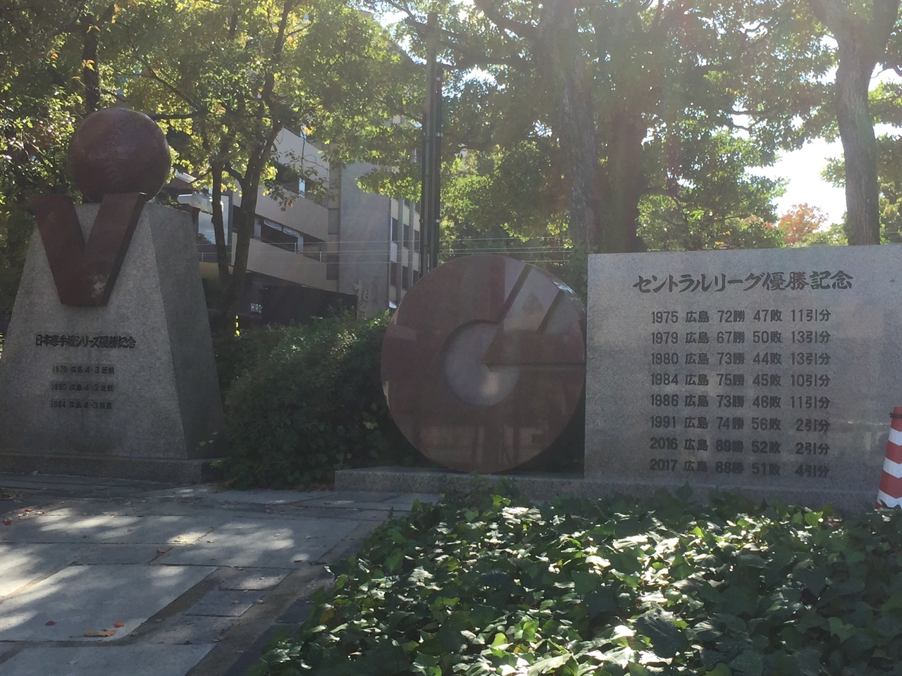 路面電車の原爆ドーム前にあります。観光地のど真ん中で、しかも広い敷地が使われていないので、少し勿体ないです。道路側の空き地にセントラルリーグ優勝の記念碑が建っています。ここに球場があった時までの記録だけかと思いましたが、昨年2017年の優勝まで記録されていました。ただ、2018年の記録はまだでした。