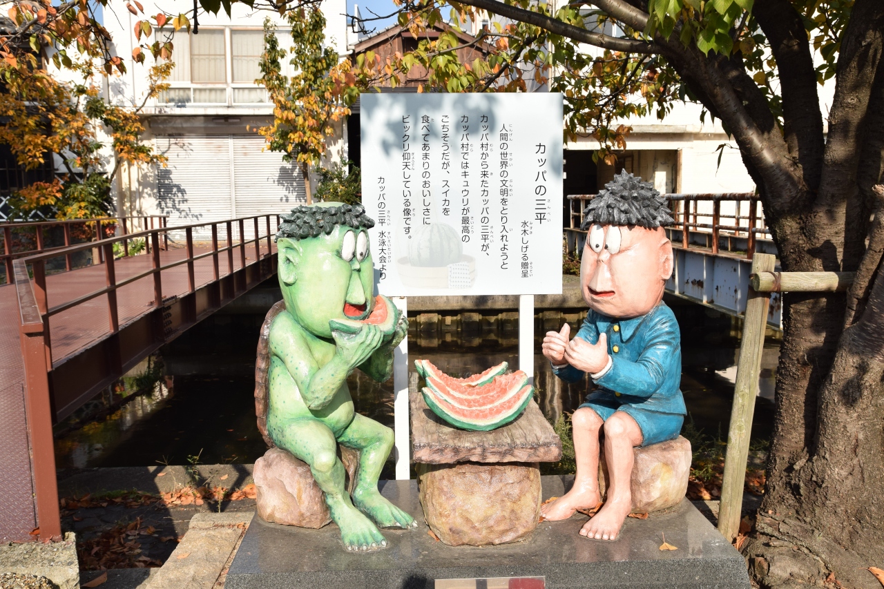 加茂川に住むカッパとの事で、いくつかのカッパの像が