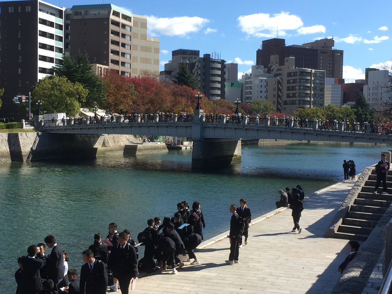広島市内を流れる川はたくさんありますが、多分一番、写真を撮られている川でしょう。というのも、原爆ドームの前を流れているからです。親水性のある護岸になっていることもあり、多くの観光客が水面を眺めたり、写真を撮ったりしていました。