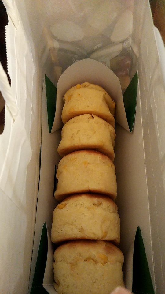 空港到着日は機械の不具合とかでパンの販売は中止でした。翌日、朝一を狙って07:00にホテルをチェックアウトして店の開店35分前に到着しましたが、既に列ができていて自分は7番目。整理券のような券は配られませんでした。購入したのはコーンパンと、折角朝一で並んだので豆パン。焼きたてを一口かじりましたが「別に」という感じ。豆パンの豆が思っていたより硬かった。