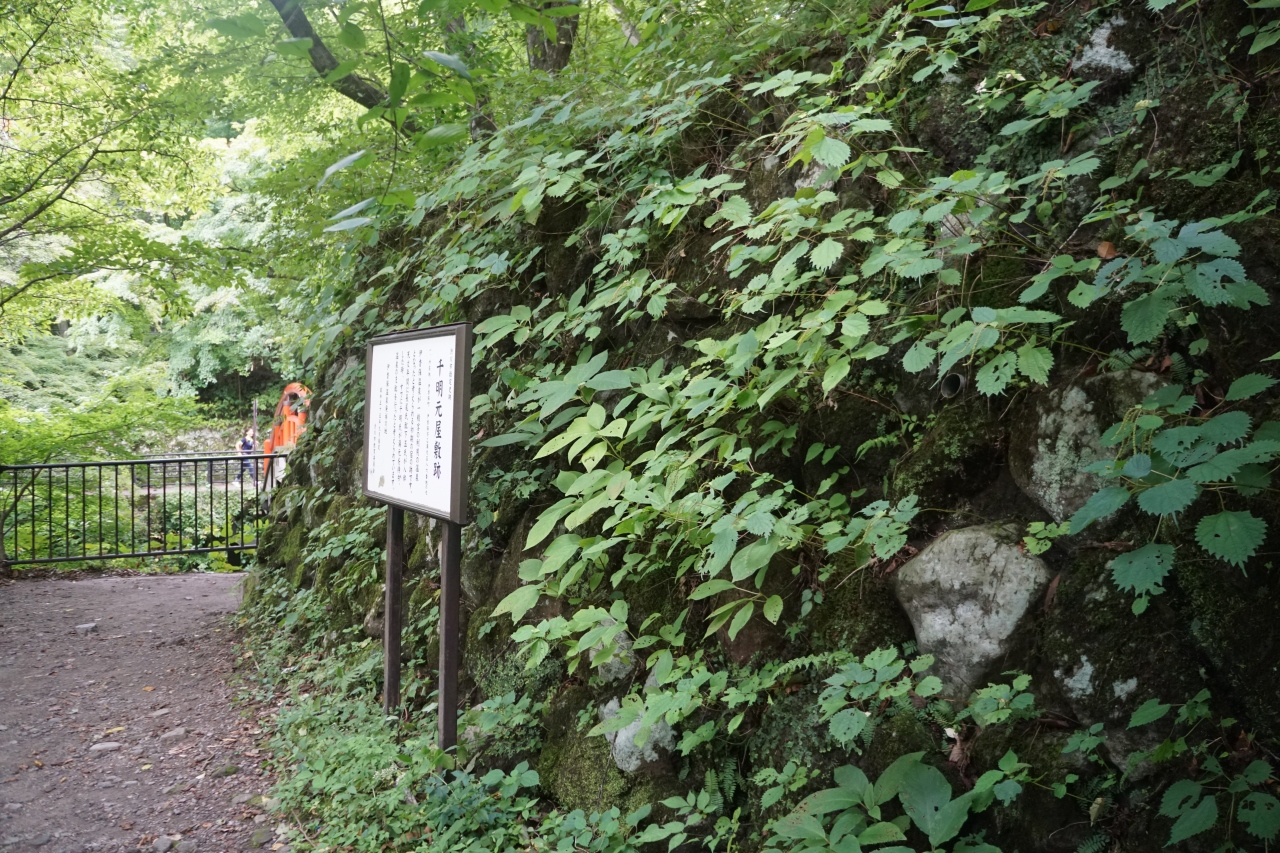 千明元屋敷跡は、伊香保神社のさらに奥。露天風呂に向かってしばらく歩くと、右手に赤い橋が現れる。それを渡ったところに石垣があって、それ。傍らに説明板が建っています。天文年間のもので、伊香保が一般客の利用の温泉となったと考えられる最初の宿跡なのだそうです。