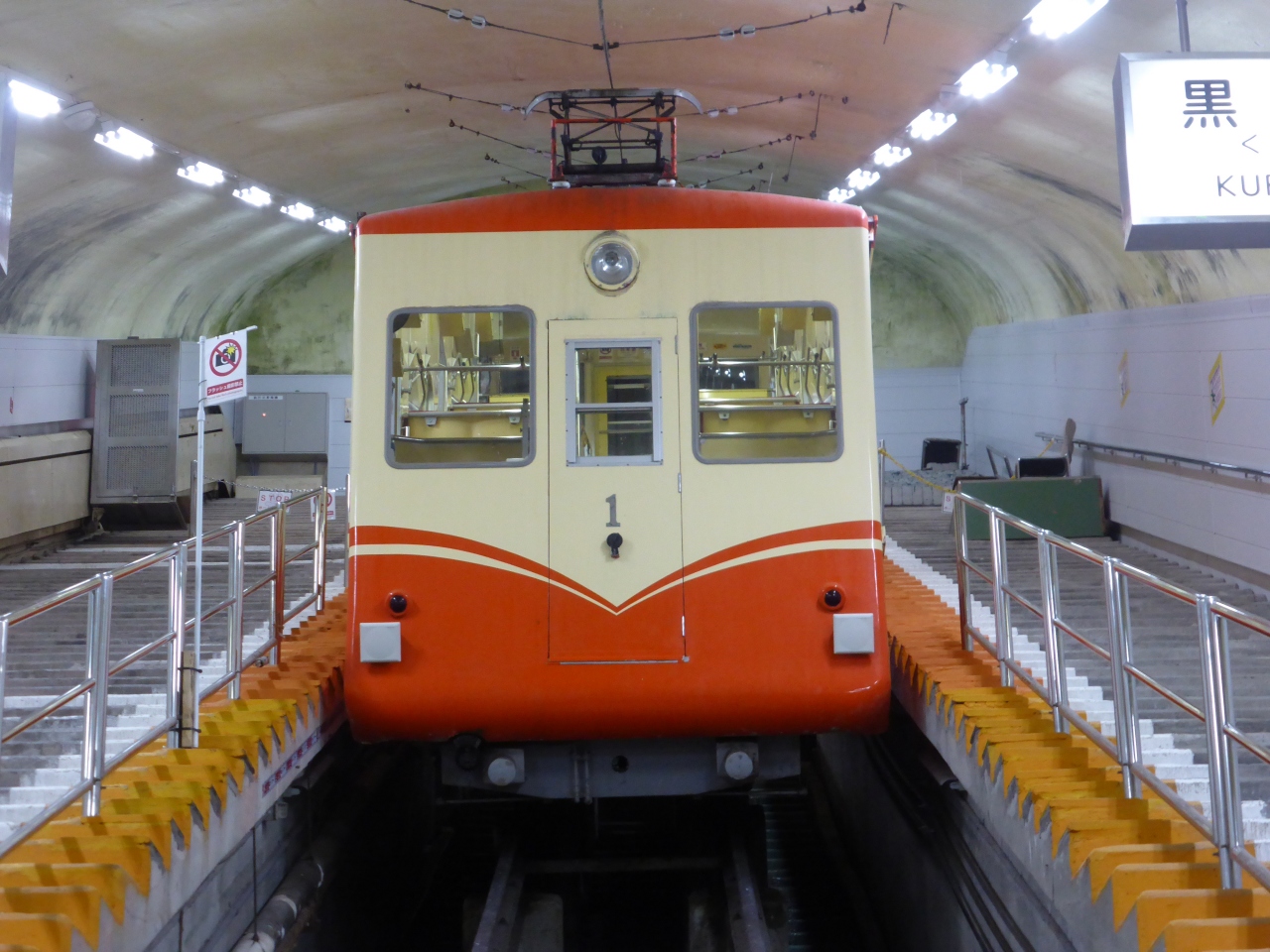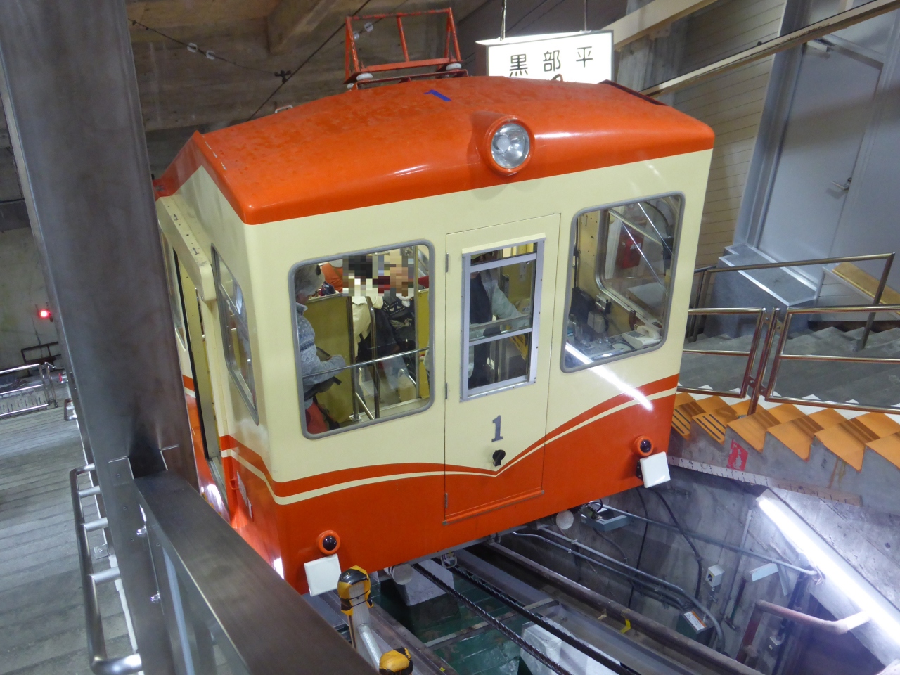 黒部平駅と黒部湖駅間の800mを走るケーブルカーです。標高差は約400mあり約5分で結んでいます。全線地下なので景観は楽しめません。黒部平に着いた時は感じませんでしたが、黒部湖駅に着いた時には気温がグッと上がりました。傾斜があるので混んでいる時は早めに並び座席を確保することをお勧めします。