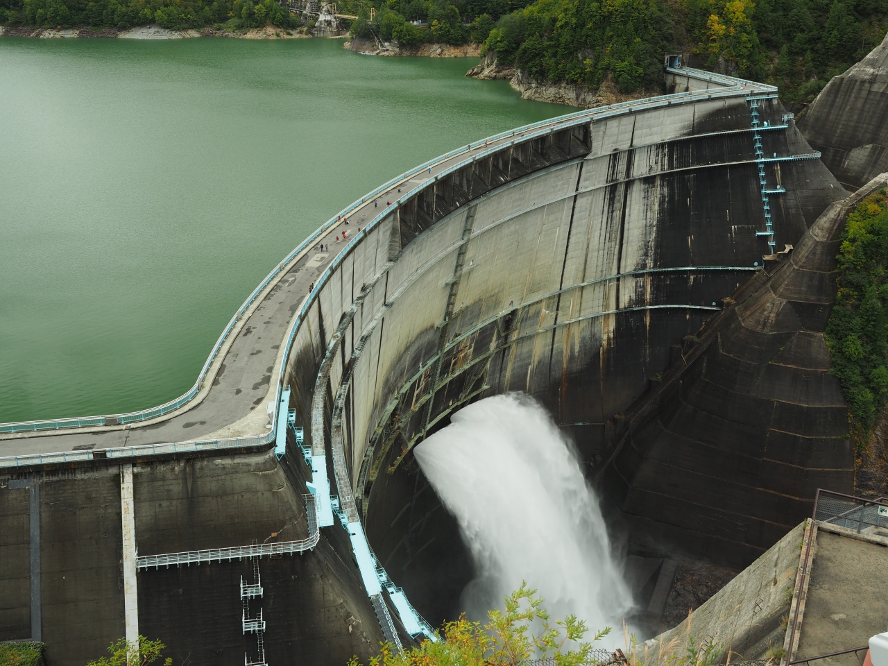 7年の歳月と延べ1000万人を費やして完成させたアーチ式ダムです。黒部湖駅からはトンネルを3分ほど歩くと突然黒部ダムのアーチの上に出ます。ダム堰堤からでも見えますが、一番眺めがいいのは階段を200段上がった黒部ダム展望台からでしょう。観光放水の様子や黒部ダム、黒部湖、立山連峰が一望です。