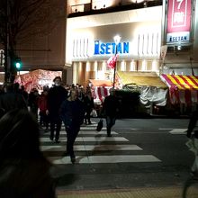 何時もの通り会社の帰りは浦和駅で降ります。タバコを吸うために西口の伊勢丹の前の喫煙所に向かいました。今日は12月の12日、調神社の12日祭りの日です。喫煙所は屋台の裏。伊勢丹の入り口も屋台で買ったたこ焼き等を食べる人たちで占拠。何時もと違った風景の伊勢丹です。