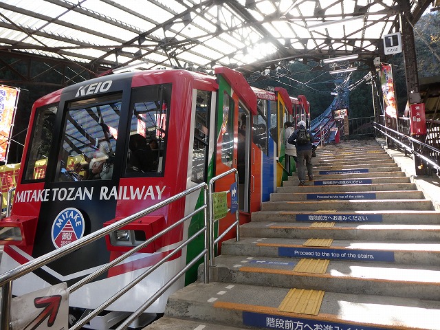 高尾山と並ぶ東京の登山スポット御岳山。麓と山頂を結ぶのが、ケーブルカーです。麓の滝本駅はJR御嶽駅からはバスで45分もかかり少々、不便なようですが、隣接して駐車場がありマイカーの方が楽かな。ただし、紅葉シーズン中の土日はよく分かりませんが。ケーブルカーは約30分に1本の割合。関東一の急勾配ケーブルカーといわれ、平均勾配22度の坂道をわずか6分で標高831メートルの御岳山駅に到着します。実際に乗ってみると、かなり楽しい急勾配でした。到着時間もホントあっという間、先を競って席に座る理由はありません。たった6分、ホントに短い乗車時間でした。