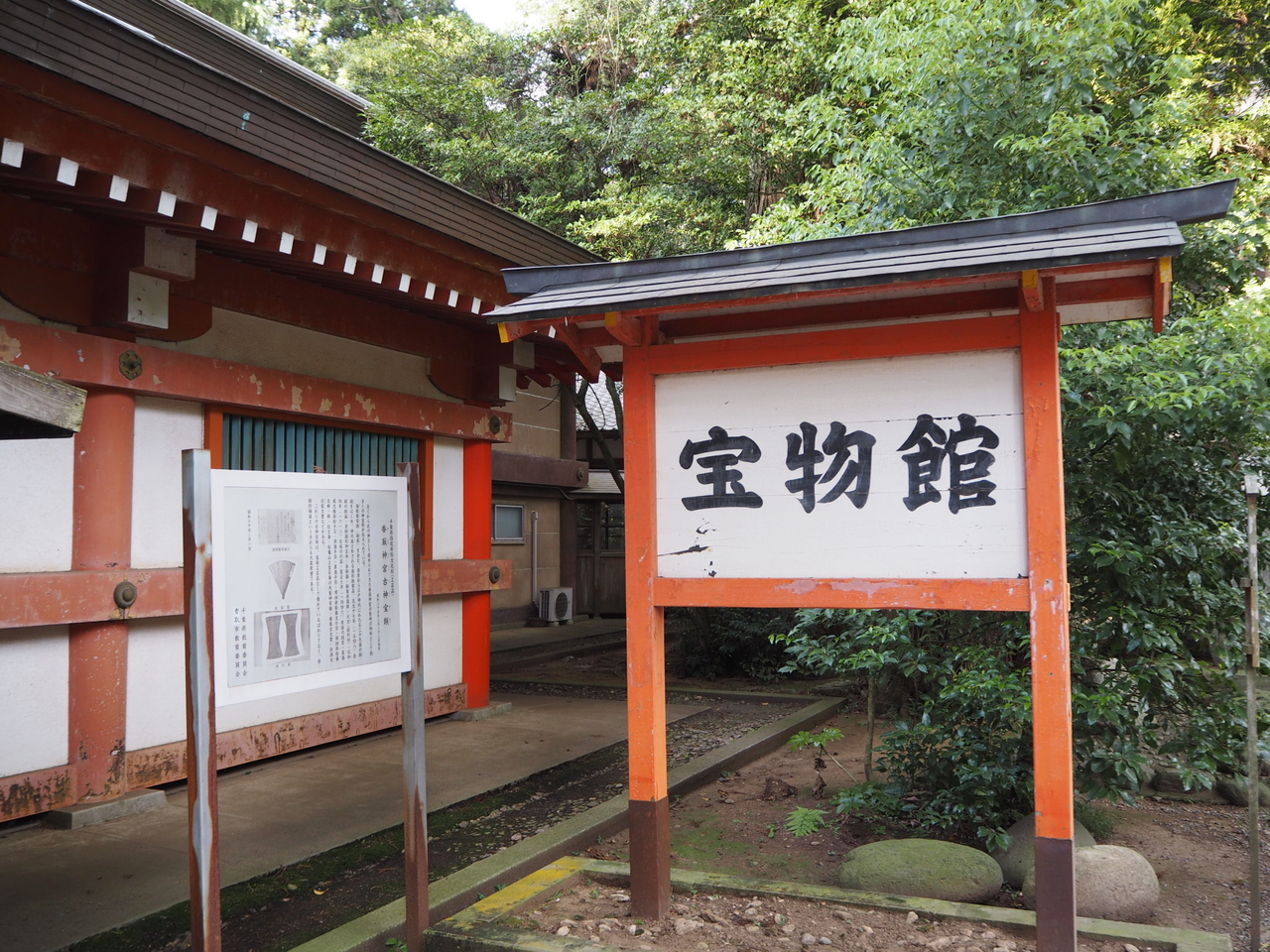 香取神宮の敷地内にある宝物館です。本殿の横の社務所の奥にありました。大きく看板が出ているのでわかりやすいと思います。香取神宮の参拝は夕方になっても大丈夫ですが、宝物館の開館時間は16時までとなっていました。