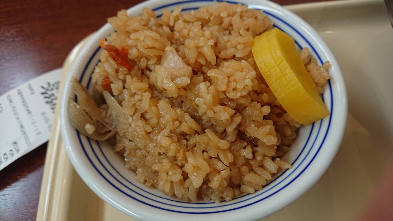 そういやぁ、前回はここできつねうどんを食べたなぁ、と入店し二種類あった朝食セットから鶏めしのセットを選択。かけうどんと鶏めしで345円。天かすフリーは関西のお約束。
