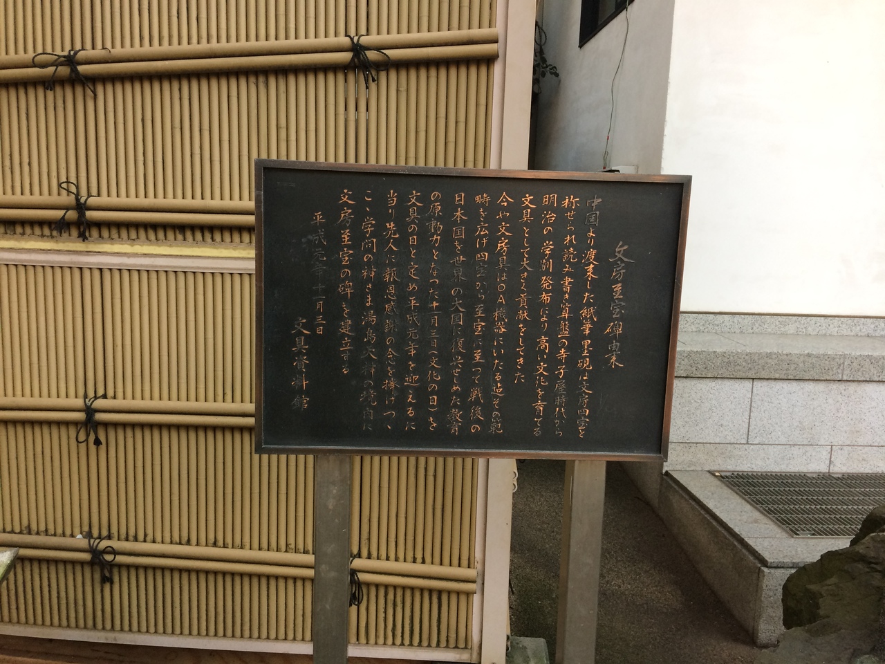 東京メトロ千代田線の湯島駅から歩いて5分くらいにあり、湯島天満宮の境内に黒ずんだ長方形の石に刻まれたそれが建立されています。文房到宝(四宝)とは中国大陸から渡来した紙や筆、墨、硯を指し、明治時代に鉛筆やペンなどが普及するまで学問を修める際に不可欠な道具として、それらのための文具を称える石碑のようです。