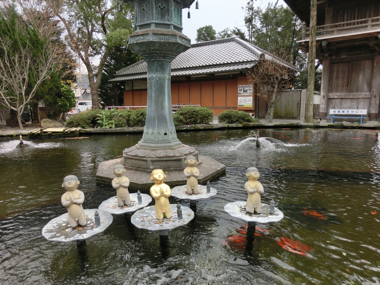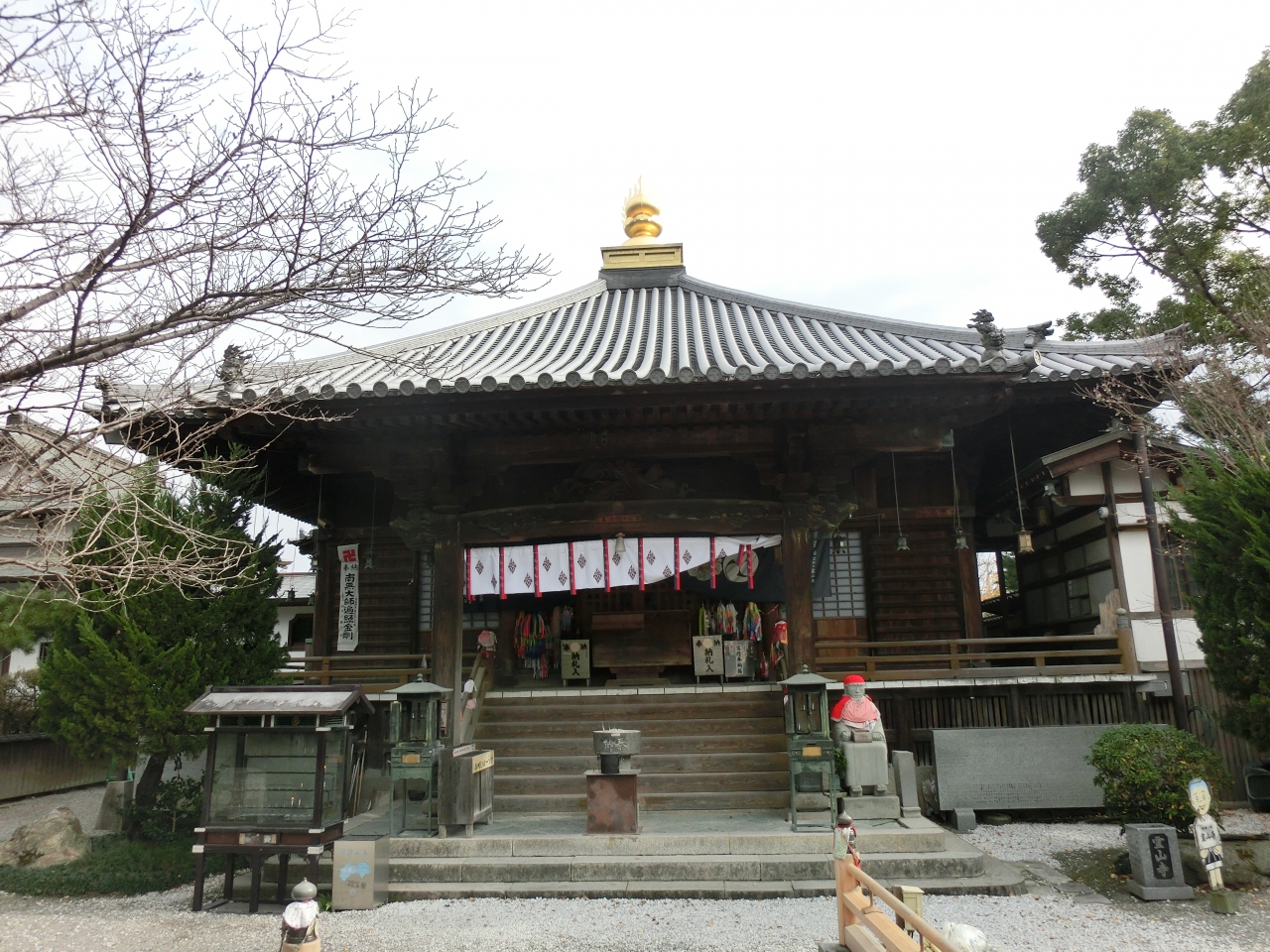 四国八十八カ所遍路旅を始めることにしました。徒歩と公共交通機関を使って2乃至3泊の旅を繰り返して八十八の札所を巡る計画です。一番札所霊山寺はJR板東駅から徒歩で10分程です。12月のオフシーズンのためか、駅から霊山寺へ向かったのは私一人だけでした。風格ある仁王門が出迎えます。霊山寺は2012年に参拝していますがお遍路として四国第一番霊山寺の札の掛る仁王門の前に立つと身が引き締まる思いがします。門前に白いお遍路姿のマネキン人形が立っています。境内はとてもきれいで右手に鯉の泳ぐ泉水池があり池に浮かぶ稚児像の可愛い姿が目を引きます。左手には鐘楼と多宝塔、正面に本堂、右手に大師堂が建っています。本堂と大師堂の場所を確かめた後、駐車場脇の納経所・売店で輪袈裟と納札を買いました。納札には日付、住所、名前を書き、本堂と大師堂の納札箱に入れます。本堂と大師堂で御経を唱え先祖供養、家内安全、健康長寿を祈願しました。燈明の灯る本堂内はとても厳粛な雰囲気で薄明りの中、龍の天井画が印象的でした。本堂の手前左手には初七日から三十三回忌までの供養の為の不動、釈迦、地蔵等の等身大の石像が13体祀られており興味深く参拝しました。最後に再び納経所を訪れ事前に買い求めていた四国霊場八十八ヶ所専用の納経帳に御朱印を頂き、御本尊の「お姿」を頂戴しました。お姿は御朱印後に各お寺で頂くことができ、霊山寺で頂いた白い御影袋に納めていきます。境内では白衣に菅笠姿も含め何名かのお遍路さんを見かけましたが殆どが車遍路のようでした。