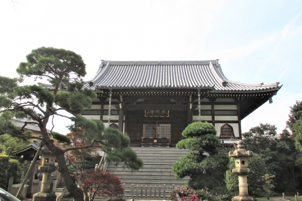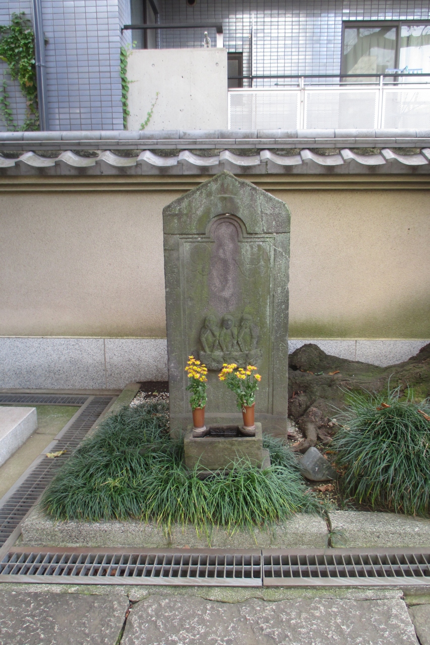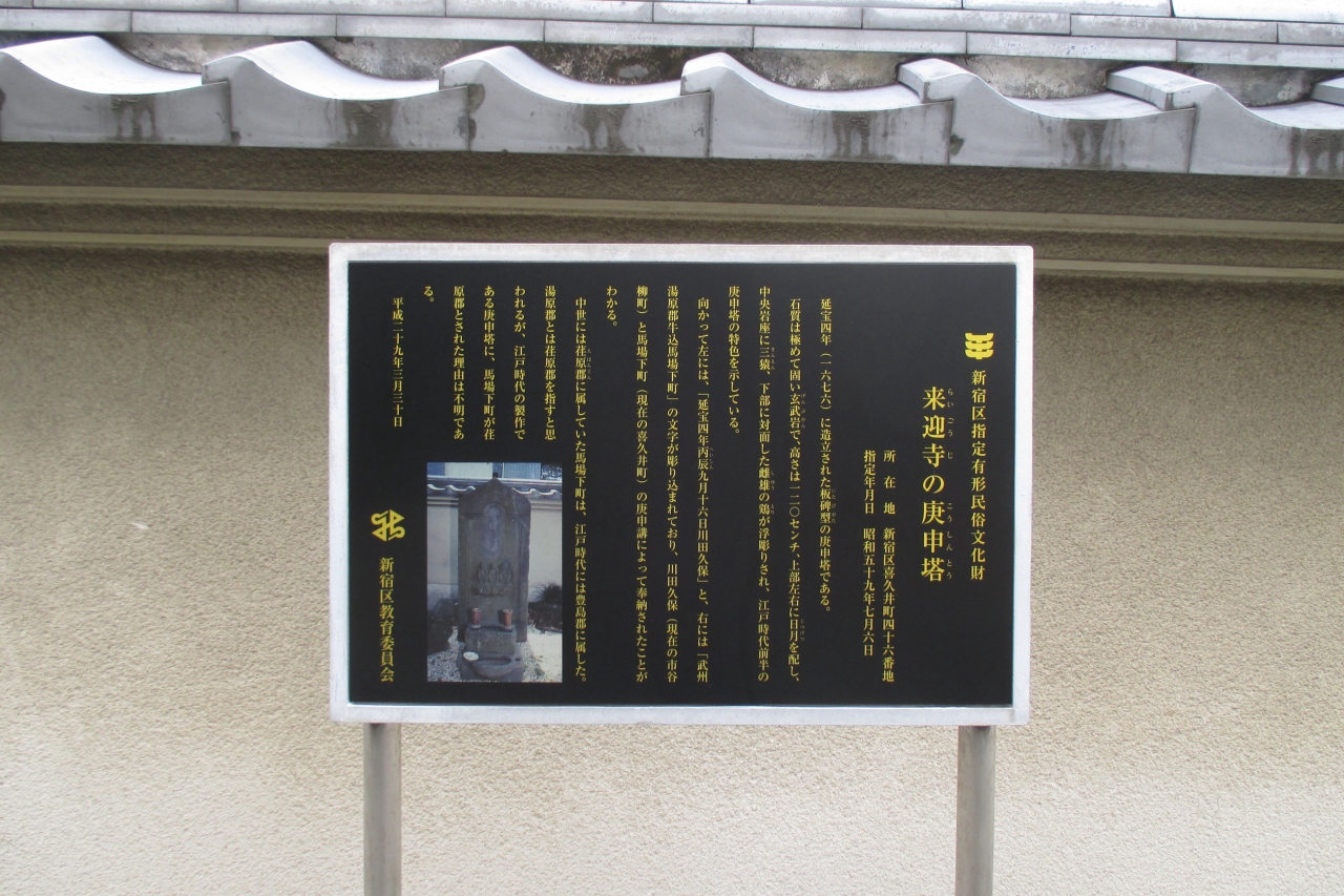 來迎寺は、夏目坂の坂上右側にありました。参道を入って行くと、来迎寺の案内はありませんが、庚申塔の案内が立っていました。その庚申塔は山門を入ったすぐ左手にありました。延宝4年(1676年)のもので、高さは120cmほどです。江戸時代前半の特長を示しているとのことです。新宿区内最古のもので、中央には三猿が刻まれています。高田の宿坂近くにある根生院にも元禄3年(1690年)の庚申塔があって、同じ様に三猿が刻まれていますが、こちら来迎寺の方が大きくて傷みが少なくきれいです。