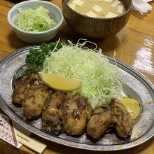かきは5粒で大きい。火を通して衣がない状態なのでかなり大粒。レモンと和がらしが添えられている。ふんわりしたかきの身をほうばって至福。ご飯はハーフだと百円引きになるのは良心的。