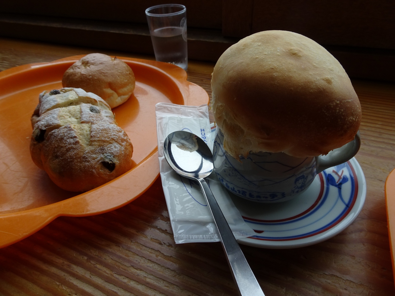 横手山山頂にある雲の上のレストランというキャッチフレーズがあるフュッテです。なぜかロシア料理なんですね。ボルシチはトマトベースの野菜スープ、クリームシチューをパンで閉じ込めた、きのこスープ。人気なのでこの2つは食べました。ともに1000円と少々値が張りますが、景色を見ながらの食事は美味しくいただきました。