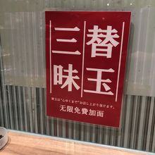 座った席のテーブルの前に「替玉三昧」、中国語でも「無限免費加麺」とポスターがある。替玉が無制限に無料ということか