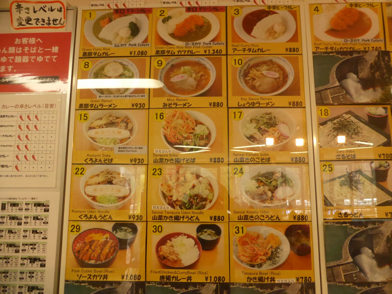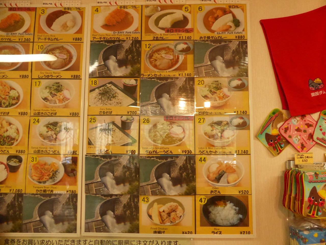 ランチで伺いました。台風が接近中という事もあり、さほど混雑もなく着席。券売機で食券を購入しセルフで受け取ります。食べたのは黒部ダムカレーとアーチダムカレー。黒部ダムカレーは辛口のグリーンカレーですが、実際はさほど辛口ではなくピリっとする程度。挽肉が使われていてキーマカレー風です。ヒレカツ2つで食べ応えはありました。アーチダムカレーは中辛のビーフカレー。ジャパニーズカレーという部類だと思いますが、牛肉はもちろん野菜も具が小さい。味は可もなく不可もなく。他にもメニューは豊富ですが、選ぶならやっぱりダムカレーになってしまいます。