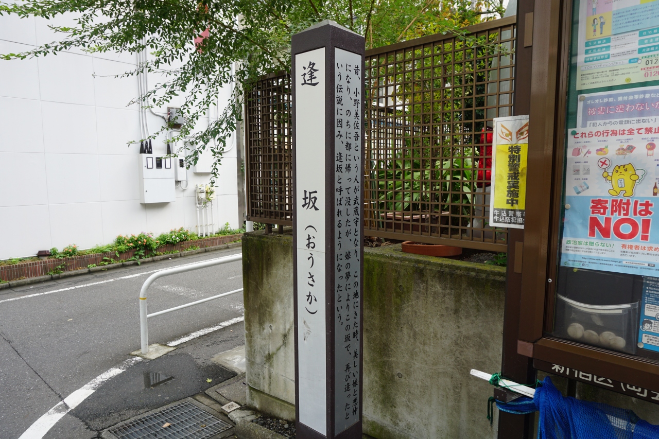 小野美佐吾という人が武蔵守となり、この地にやってきた時、美しい娘と恋仲になる。その後、都に帰って没してしまうのですが、娘の夢でこの坂でまた逢うことができたという伝説に因む名前。けっこうだらだらと上がって行く坂。ちょっとしんどいです。