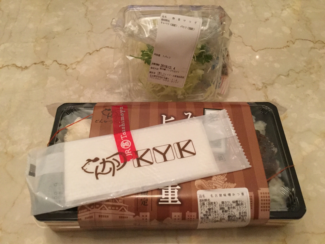 名古屋から新幹線に乗る前に、タカシマヤ地下食料品フロアにお弁当を物色しに行きました。この時に店頭で作っていたお弁当があまりに美味しそうで購入。「名古屋味噌かつ重」はキャベツが別容器付きなので、食べる時までシャキシャキを保っていました。観光客度も満点だと思います。
