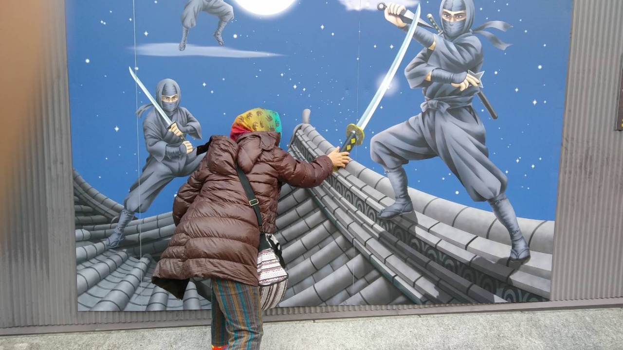 歩いてみると微妙に遠い。。。結局車で行くことにし、お手する黒猫がいる和菓子屋「おおにし」の横にある駐車場がわかやのスペース空いてたので、ここに停める。駐車場の隅に忍者と戦う撮影スポットがあるので観光客は必見。