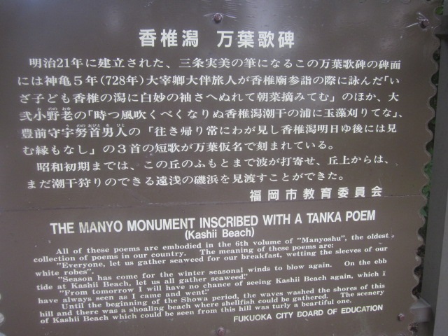 元々はこの一帯は香椎潟と呼ばれて、この高台からも海を見渡せたそうです。この碑自体は明治期に建てられたようですが、その当時は、もっとこの碑の歌の風景を体感できたのだろうなと、現在では都市化の中で全く海が望めない景観の中で、少し切ない気持ちになってしまいました。尚、この碑の筆跡は、あの三条実美の手によるものだそうで、昭和初期まで、この丘の麓まで波が打ち寄せていた風情を想像しながら、現代的な都市の景観を眺めると旅情もそそられてステキな時間が過ごせると思います。